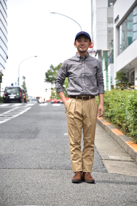 通年楽しめるチノパンも秋はチェック柄のBDシャツをタックイン。季節が進めばこれにシェットランドセーターを。