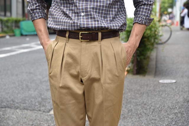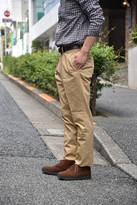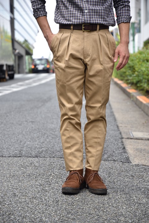 デザイナーの話が聞けるのも魅力的ですが、モンローさんの着こなしにも注目! コーディネイトのご相談も是非この機会にー! はい、本題へ行きましょう。 僕がおすすめさせて頂きます一本は「ツータックチノパンツ」