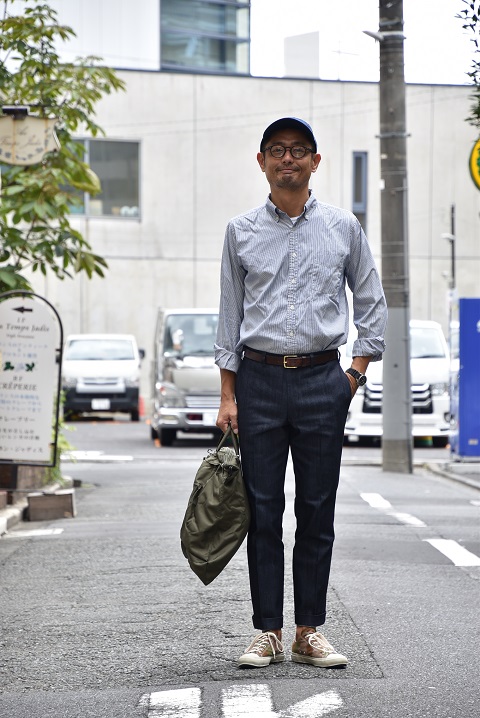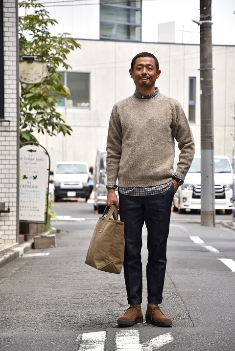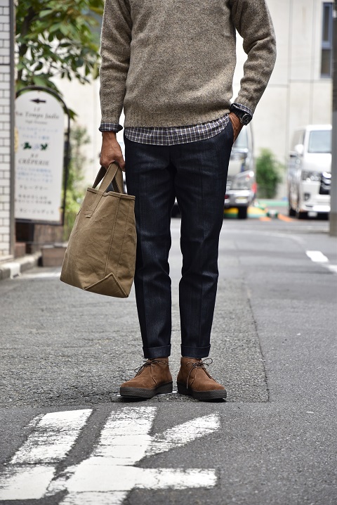 形もBARNSTORMERの1300Pは細身でシュッとしてるのが特徴でございます。下手に太パンよりも潔いところが好感をもてる秘訣でしょう。様々な表情でお召いただけるのもこのパンツの大きな特徴の一つでございまして、シャツやジャケットのコーディネイトはもちろんの事、カットソーやニットでもお楽しみいただけるのがうれしいですね。「ストレッチデニムトラウザース」を穿いてると「今日は随分キレイ目なスタイルね。後でたっぷりフ〇ラしてあげる。うふ。」と綺麗なご婦人からお声が掛かること間違いなしでございます。それでは拙いながらもオッサンのコーディネイトをご覧くださいませ。