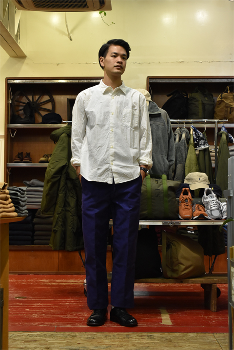 パンツは太めのワークパンツらしいシルエット。185cm,72kgで2を着用しています。