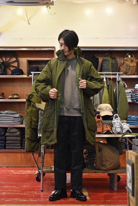 スウェーデン軍のM90でございます。 何と言ってもこのボリューミーなサイズ感が特徴!ガバっとルーズなシルエットが新鮮です。 中綿入りで文句なしの冬アウター。表地の経年変化も楽しめますよ。こちらもウェブショップには近日アップ予定です。