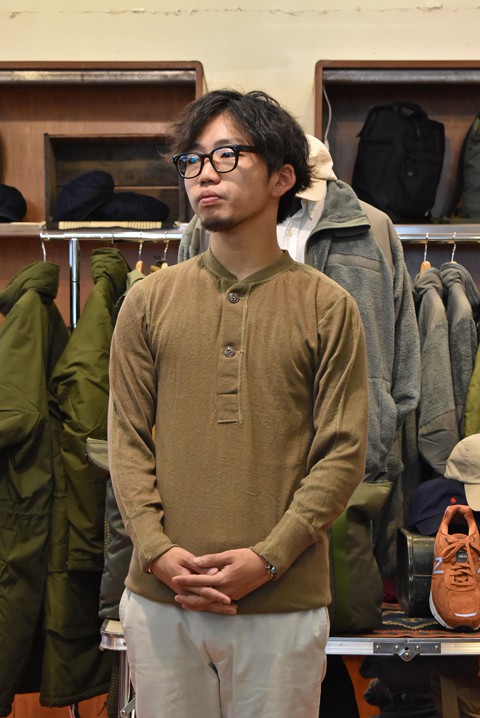 ウール×コットンのヘンリーネックT。アメリカ軍のデッドストックです。 シンプルに肌着として重宝しますが、ヘンリーネックとくればやっぱりちょい見せしたくなりますね。 秋冬に着るちょっと重めのシャツには特に好相性。探すと中々ない一着ですよ。