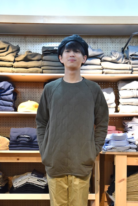 どうもこんばんは。東京スタッフの安久です。 ようやく気温も下がり、涼しくなり長袖のシャツが着やすくなりましたね。ちょうど今は秋物がドカンと入荷しています。この時期だからこそサイズや種類も豊富にございますので、去年狙っていたアイテムが買えなかった人、今年こそ良いコートを買うなどの方は是非お早めにチェックしてみて下さい。 それでは早速ですが、僕のおすすめしているブランド、スピナーベイトの『ミリタリーキルトクルー』をご紹介させていただきます。 ●SPINNER BAIT(スピナーベイト)ミリタリーキルト  ¥9,504- ブランド定番スタイルのカットソー。肩を合わせやすいラグランスリーブや、ラウンドした裾など、スピナーベイトお得意のシンプルなデザインです。素材は肌触りの良いコットン素材となっております。 ミリタリーのM-65フィールドジャケットなどのライナーをモチーフに、ゆったりした着心地で、程良いルーズ感を出したカットソー。 野暮ったくならならないのはスピナーベイトならではの絶妙な身幅と丈感で作られているからです。一枚でも重ね着でもサマになる雰囲気の良い仕上がりです。いい感じのゆとりのあるラフなシルエットは様々なスタイルに合わせられるかと思います。 その時の気分でジャストサイズはもちろん、サイズアップでルーズに着ていただくのもおすすめ。季節も秋から冬の終わりまでしっかり着れる使い勝手の良い一枚です。 ミリタリーの雰囲気をお楽しみいただけるオリーブ、着回しがしやすいブラック、季節感を感じられるキャメル、全部で三色展開となっています。三色展開なのできっとお気に入りのカラーを選べるかと思います。 ハンドウォーマーポケットが良いアクセントに。裾はラウンド型になっています。 ●ジャケット N.O.UN(ナウン)  サイズ:2  ¥23,760- ●カットソー SPINNER BAIT(スピナーベイト)  サイズ:42(M)  ¥9,504- ●パンツ BARNSTORMER(バーンストーマー)  サイズ:XS  ¥20,520- ●シューズ G.H.BASS(ジーエイチ・バス)  サイズ:US7  ¥17,280- 身長170cm 体重60kg 靴のサイズ25.5cm ナウンのワンポケットジャケットと合わせてミリタリー要素を入れたカジュアルスタイルにしてみました。他にも紺ブレやバラクータのG9,FOBのモールスキンジャケットなどを羽織ってもオススメですよ。パンツはマッカーサーパンツやM65の軍パンなどの太めのパンツと合わせることでラフで無骨ながらもまとまりのあるスタイルをお楽しみいただけるかと思います。 肌触りも良く、生地も二枚仕立てで保温性もあるので、これからの時期に活躍するトップスとなっております。サイズ展開が豊富な今の時期にぜひお早めにお試しください。 大阪店インスタアカウント⇒@ZABOUOSAKA13 東京店インスタアカウント⇒@ZABOUTOKYO ☆通販で購入、商品詳細など詳しく見る! ⇒ZABOU WEB SHOP(ウェブショップ) 通販サイト ☆実店舗へのご案内、お店までへの行き方を地図や動画でご紹介! ⇒ZABOUのお店