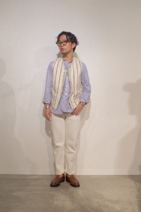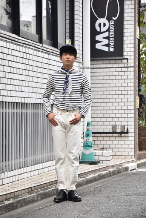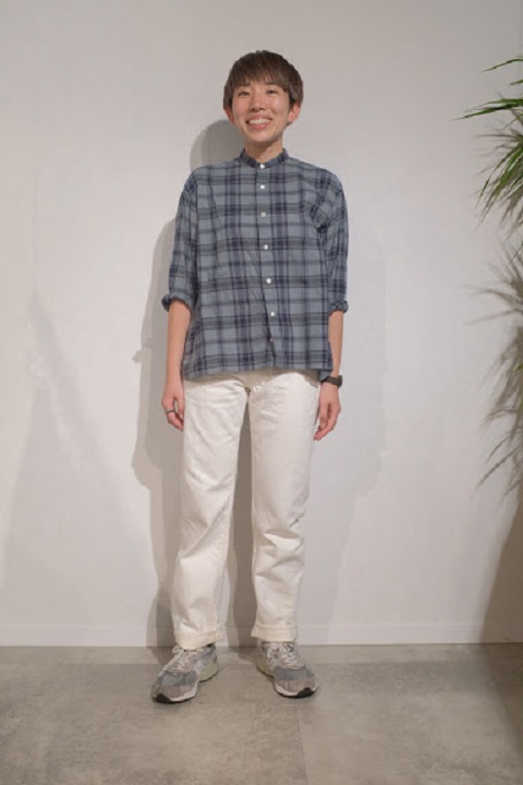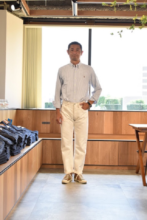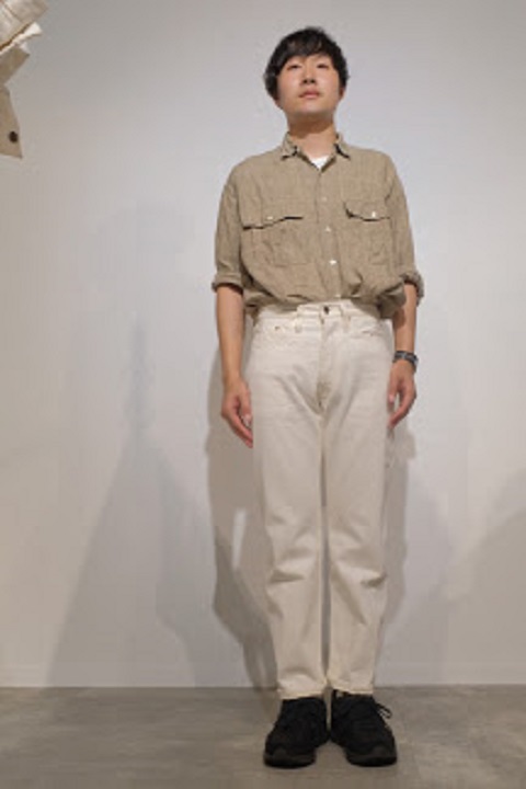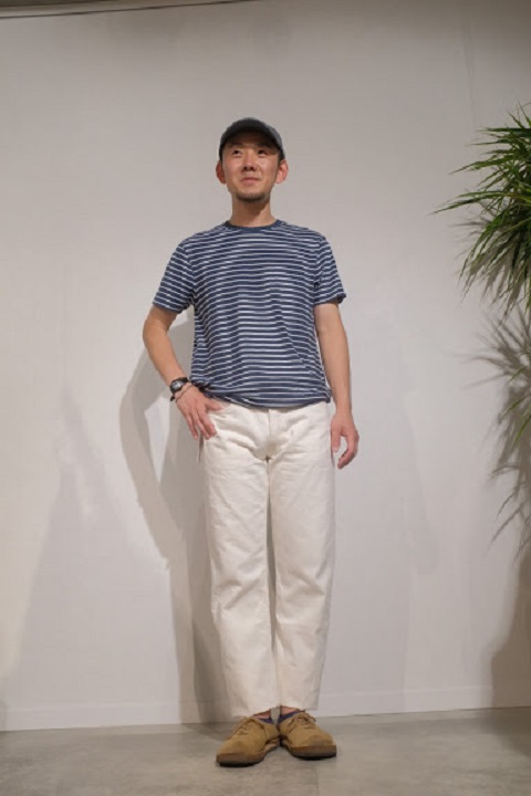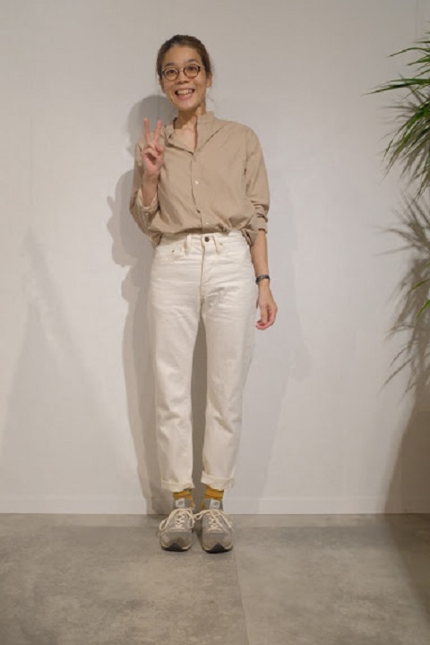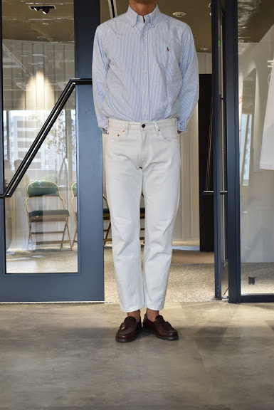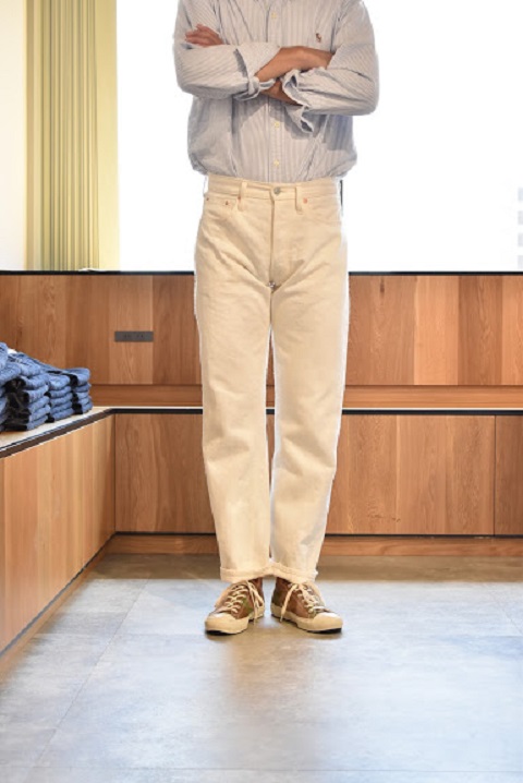 サイズ選びに関しましては、基本的にはブルーのサイズと同じ選び方で問題ございません。穿き方につきましては十人十色でございます。ホワイトデニムの特性を活かして細身で穿くもよし、ワンサイズアップでちょい楽で穿くもよしでございます。サイズ選びが最も迷う原因かと思いますので、各個人の思うがままにコメントを記載させていただいてございます。各スタッフの写真とコメントをご覧いただき少しでもご参考になれば幸いでございます。