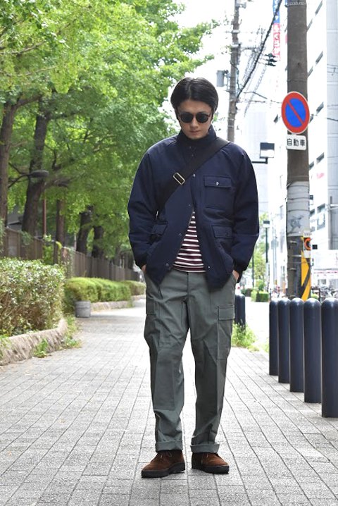 「N.OU.Nの新作アウターを用いたスタイル!ロクヨンクロスを使用していて、経年変化が楽しみな一着。BDUの無骨な印象も足元はスウェードのチャッカを合わせれば落ち着いた印象に。」