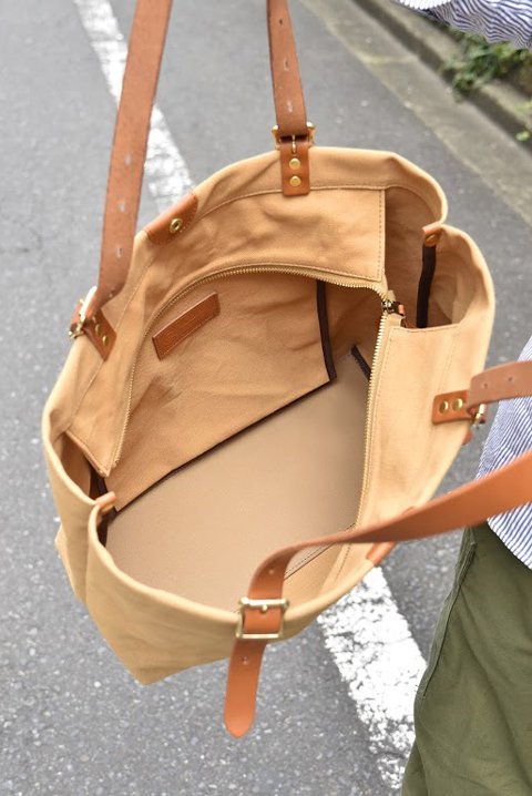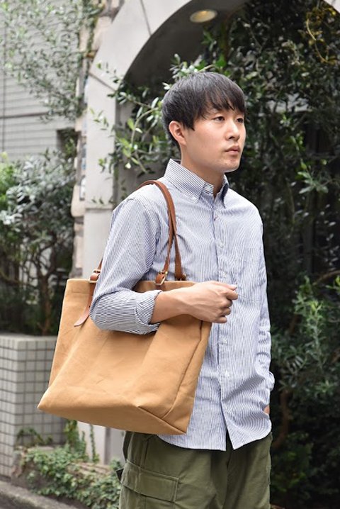 「大阪のレザーブランドSLOW(スロウ)から岡山県の倉敷帆布を使用したトートバッグが入荷しました。こちらはオイルドコットンと言われるキャンバス素材にオイルを含んだ素材なので、使い込むほどに生地が柔らかくなり経年変化をお楽しみいただけます!中はジップで閉じることができ、大容量で男性にも女性にオススメですよ。」