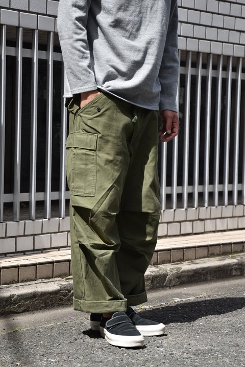 「スタッフ大井のM-65フィールドパン。着用期間は約3年。全体的に色も抜けてきて、所々アタリもついてますね。今の時期はカットソーや、シンプルなボタンダウンシャツと合わせるのがおすすめ。ぜひ一本、ミリタリーパンツはいかがでしょうか?」