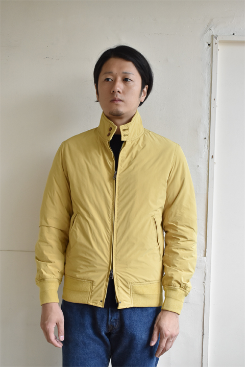 ハリントンジャケットの衿をニットリブのショール衿に。裏地にはダウンキルトが施されています。