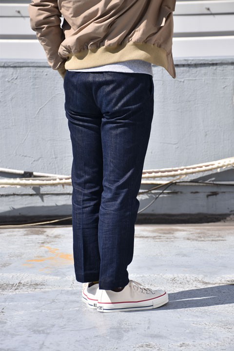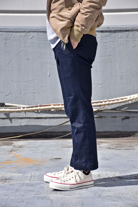 お次はTC ストレッチチノと同型ですが、こちらはインディゴ染めのデニムトラウザーズです。穿き始めは無表情ですが、穿く度に生地も柔らかくなりアタリも付き色落ちも・・・どんどんハマっていきます。