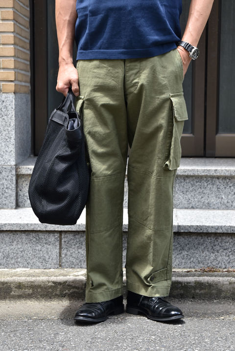 70年代のアメリカンワークウェアをイメージし、深い股上に裾までストンと落ちるややルーズなシルエット。細部のディテールもさることながらフラッシャーや紙パッチも唯一無二のデザイン力◎