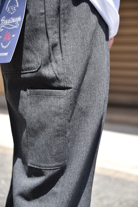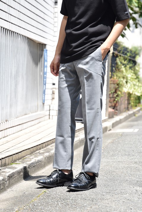 これまで登場することのなかったアーカイブ商品。夏用ウール、トロピカルウールのスラックスは生地が軽く通気の良さに定評アリ。クラシックなディティール、シンチバックが見た目にもアクセントに。