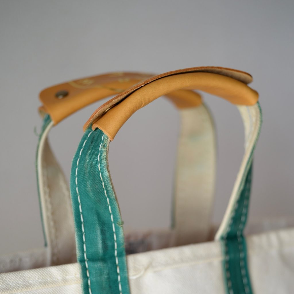 レザーハンドルを突き合わせて押した割印のようなデザインにする事で、トートに付けた時に柄の様に見える感じになっています!