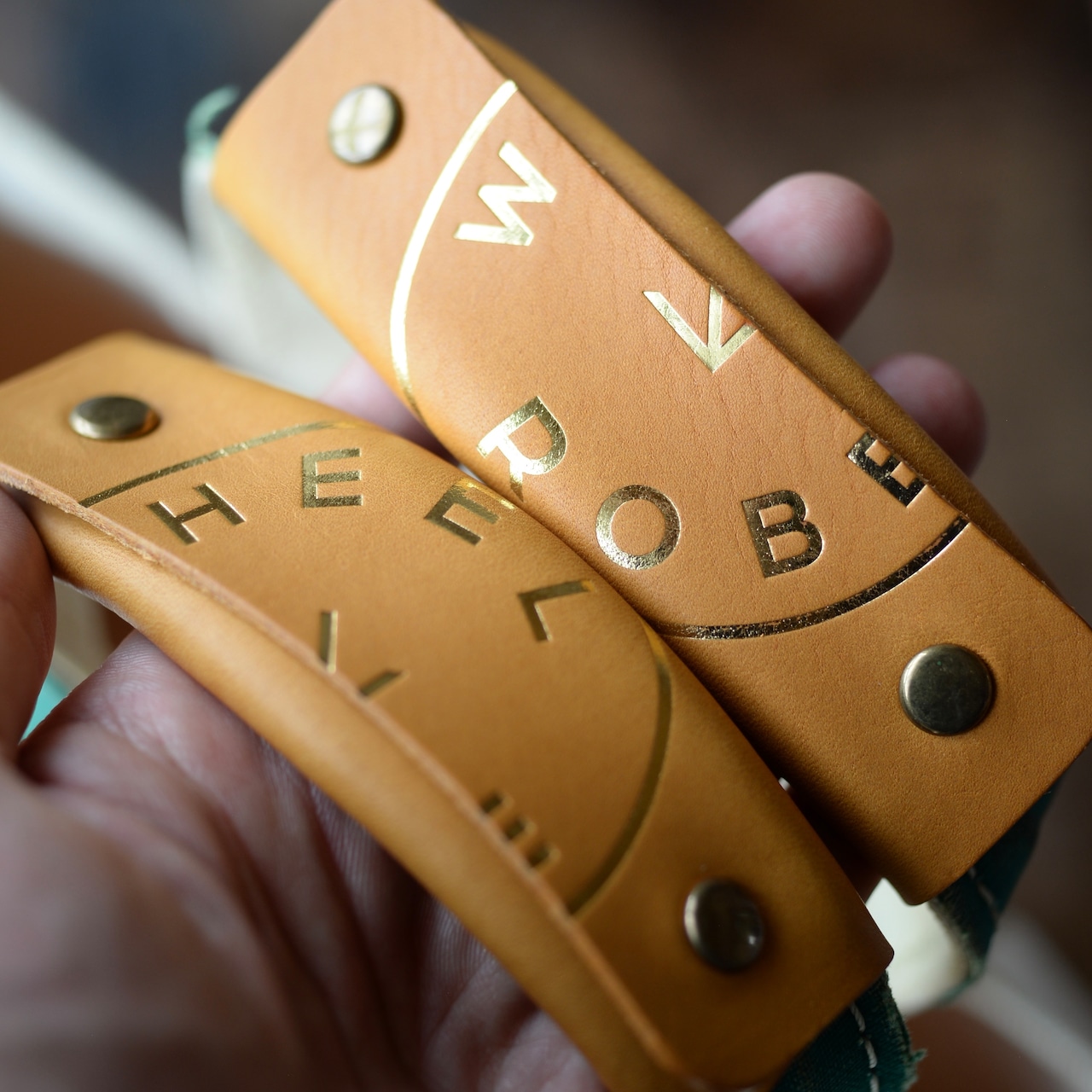 使わせて頂く革でそのままハンドルにしてしまってはつまらないと考え、WHEELROBEさんのブランドロゴを大きくしたスタンプを作らせて頂き押させて頂きました。