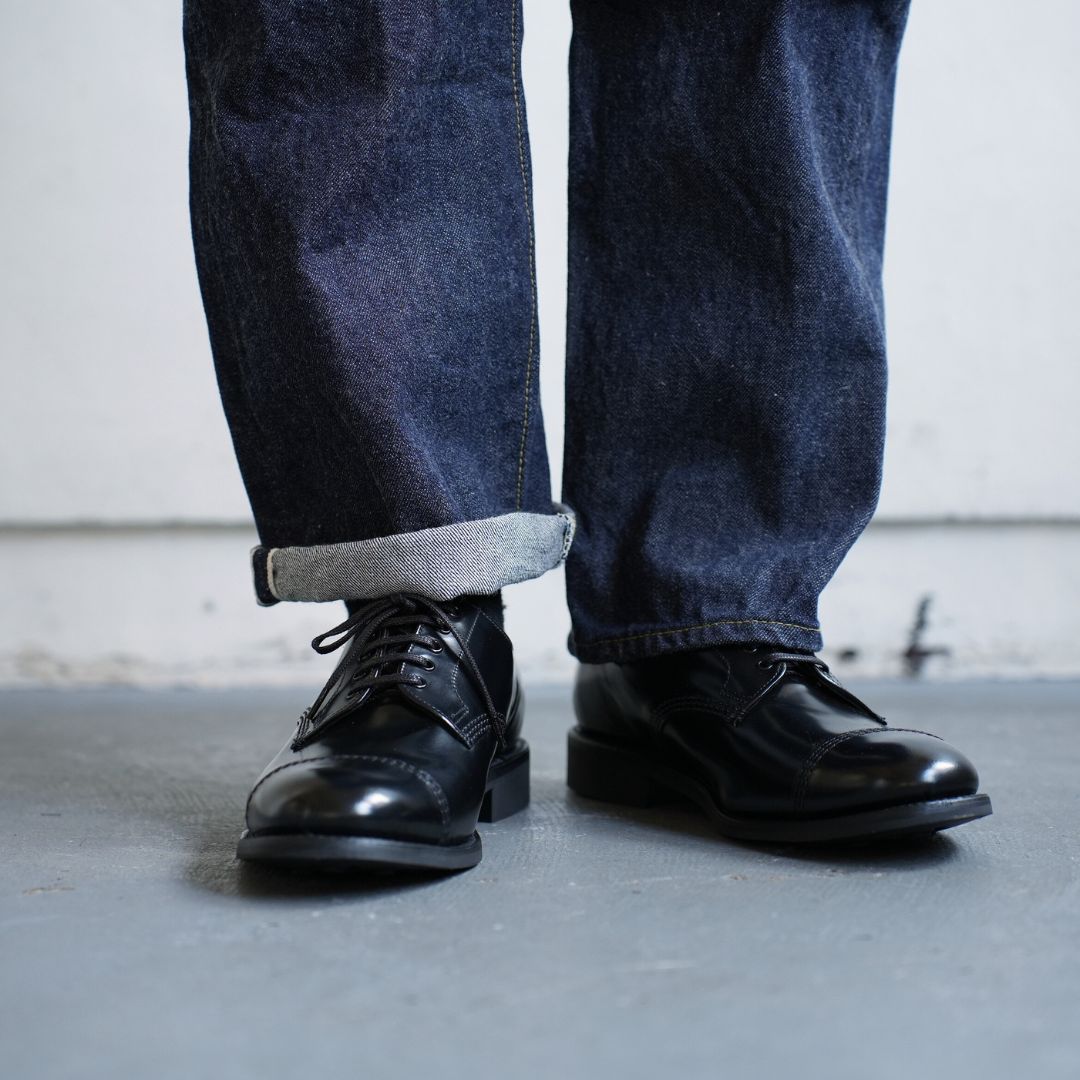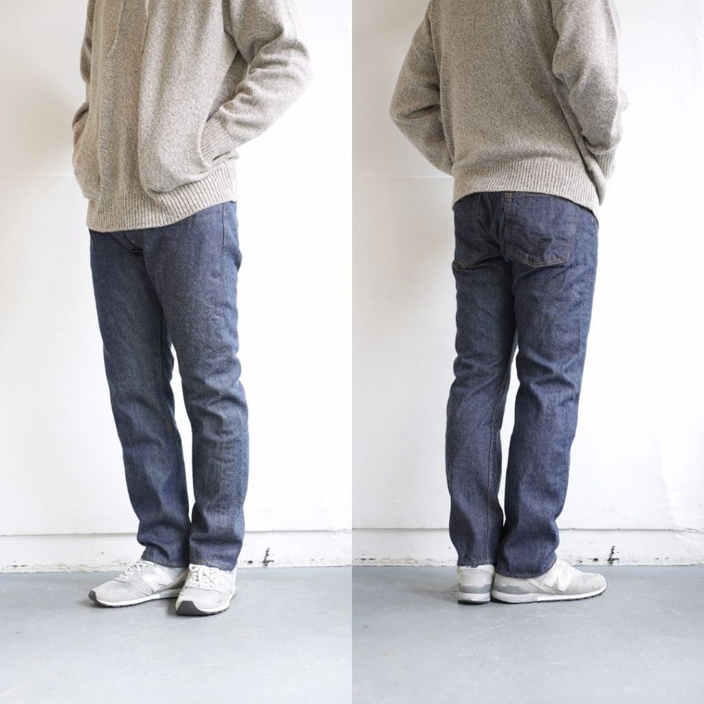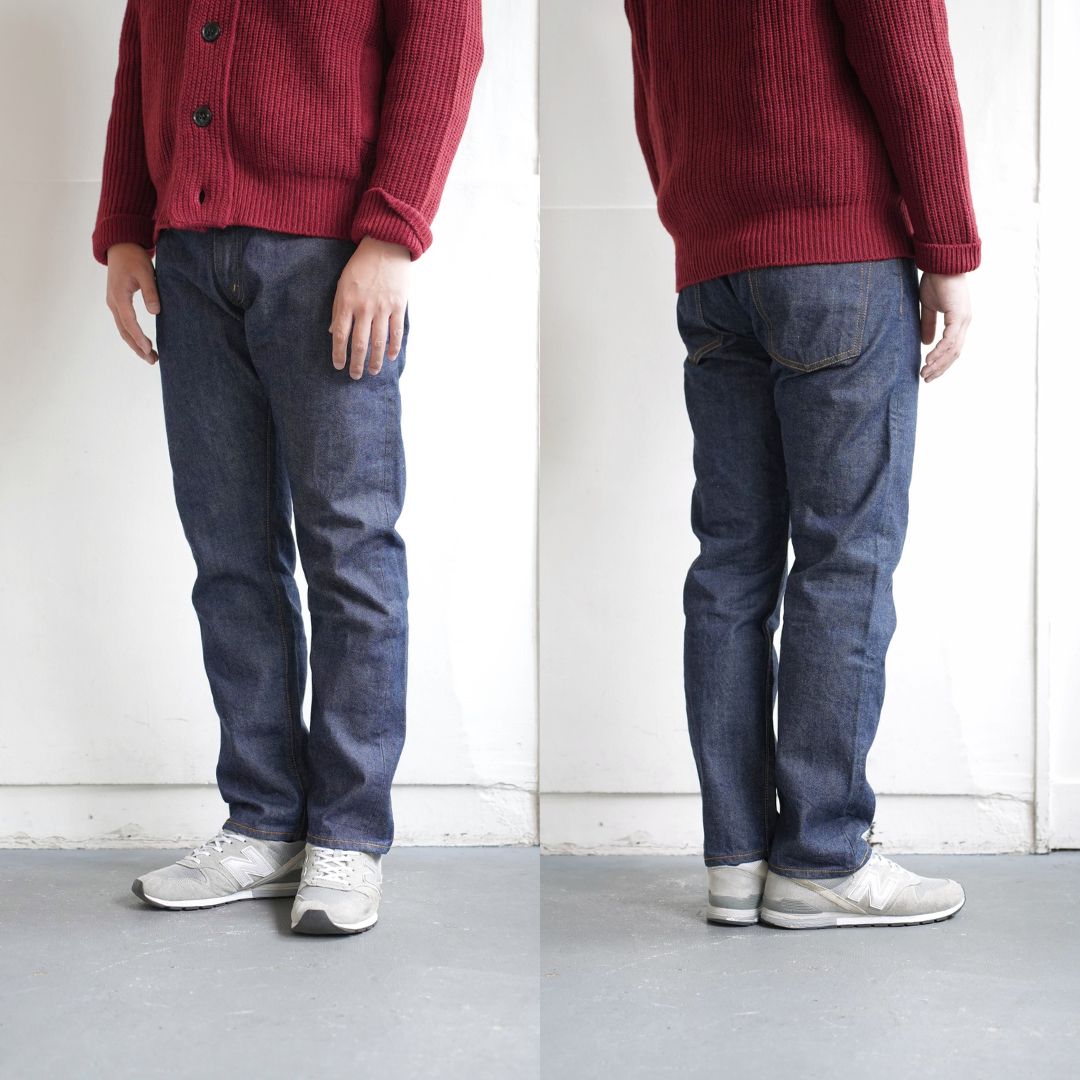 テーパードストレートで日本人の体型にフィットするべく考え抜かれたシルエットは穿き手の脚を長く、きれいに見せます 。ファッションアイテムとして取り入れられ始めた頃のモデルがベースとなっている為、カジュアルな着こなしには勿論、ジャケットやヨーロッパの綺麗目な着こなしにもとても相性が良いですね。