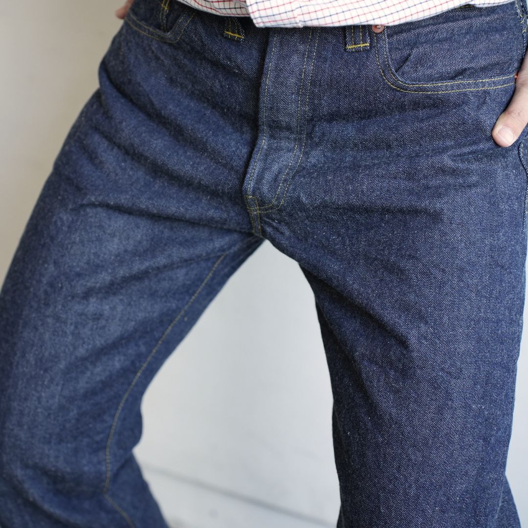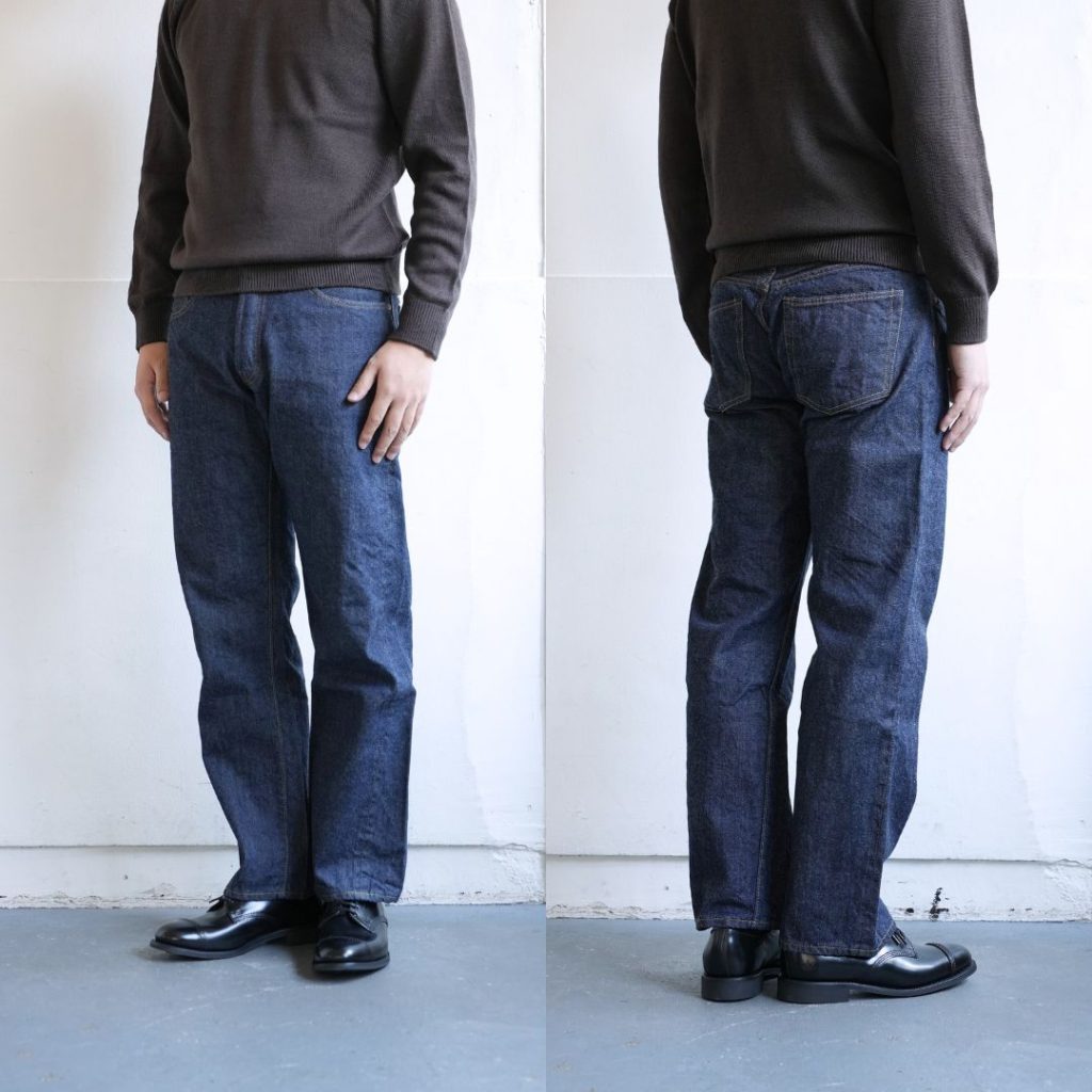 1950年代のアメリカのワークパンツをベースにした、セミワイドストレート。ライトオンスの生地を使用しておりシルエットの緩さも相まって、トラウザーズ感覚でラフに穿くことができます。 革パッチや隠しリベット、オフセットセンターループなど、XXモデルのディテールを用いているのが特徴です。
