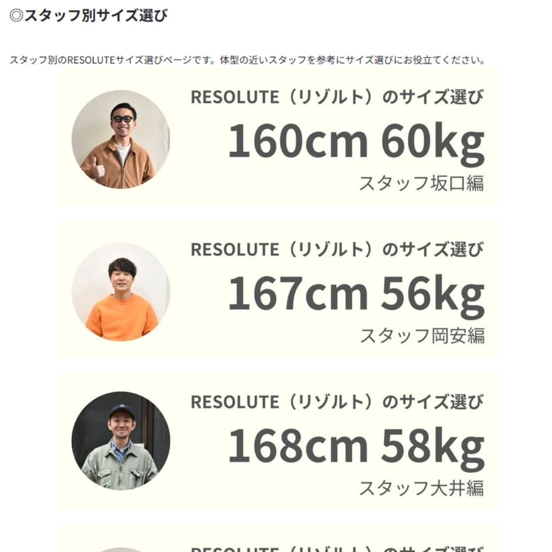 残る711、714の紹介の前に、杉本的サイズ選びのポイントをお伝えします。WEBSHOPのRESOLUTEの商品ページにも載っていますので、サイズ感で悩まれているお客様はこちらも是非ご参考に。