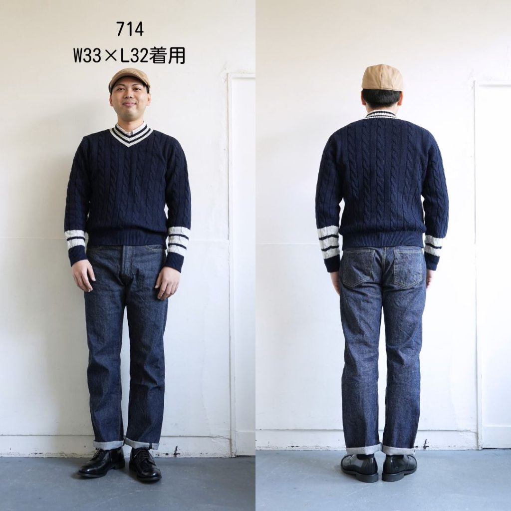 714も711同様にライトオンスの生地。太さがあり楽な着用感です。股上が深い分、他の型よりウエストサイズを一つ下げてちょうど、というお客様もいらっしゃいます。ステッチがブランドカラーのオレンジでなく黄色なのも特徴です。