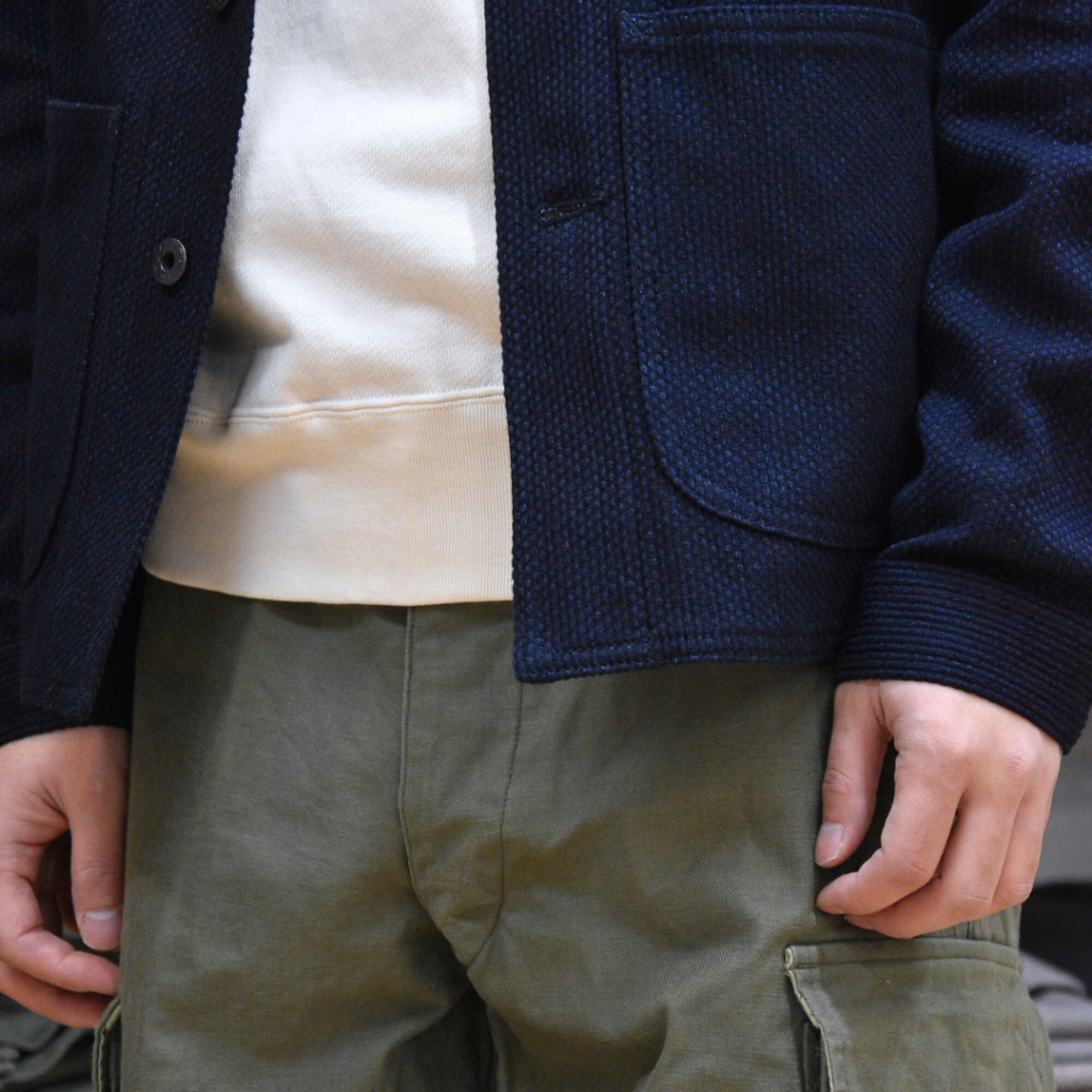 艶やかなスウェット生地と、ジャケットのカサッとした生地感のコントラストがスタイルに奥行を持たせてくれます。