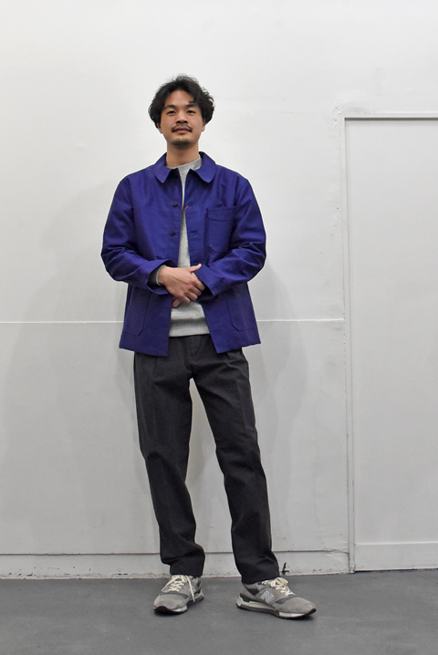 スウェット、パンツ、靴をグレートーンで統一してみると、ガリスのフレンチブルーが際立つコーディネートとなりました。