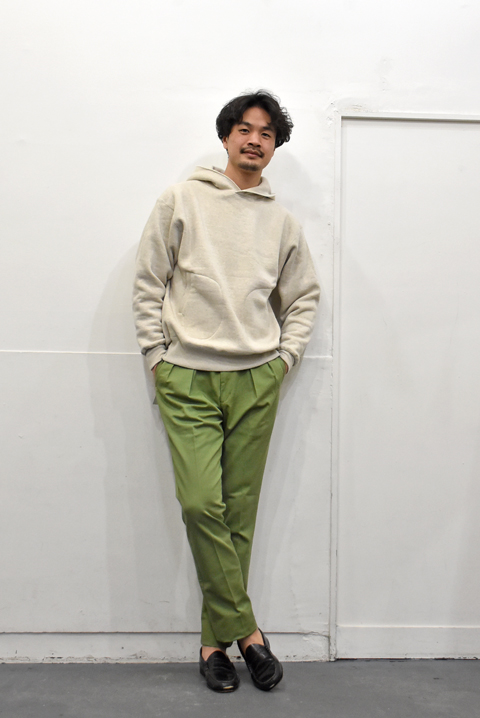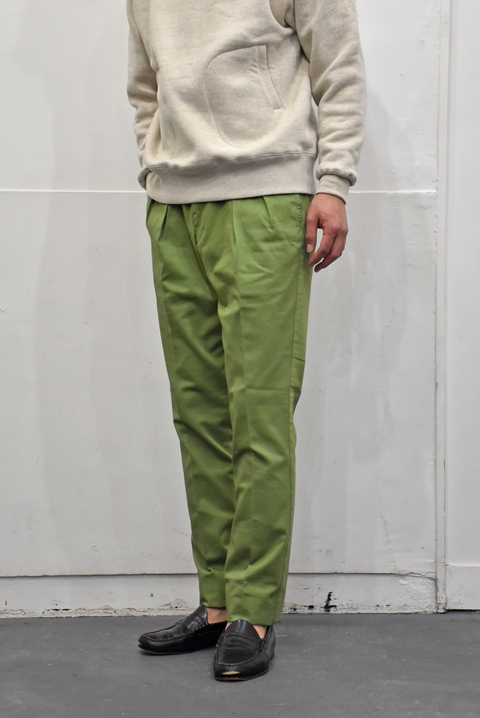 バーンストーマーフェア限定色のセージグリーンのトラウザーが春にピッタリではないでしょうか。オリーブとはまた違ったワントーン明るいグリーン。