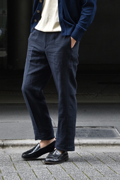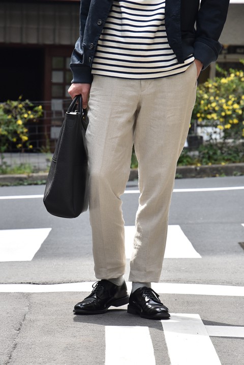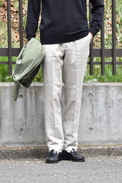 最近ジワジワと人気が高まっているドレスジャージトロピカルトラウザーの形はリネンとも相性が良さそう◎