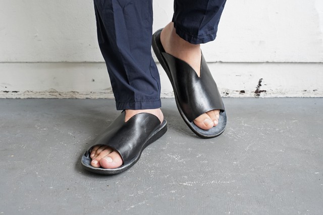 いわゆるつっかけですが、素材がレザーとなればカジュアルはもちろん少し綺麗めなパンツと合わせても◎