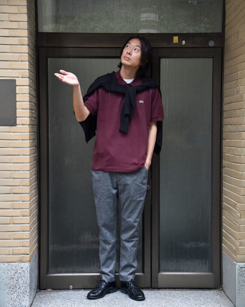 季節感を感じさせるグレーのパンツに、ボルドーのポロ。大人のお出かけスタイルです。