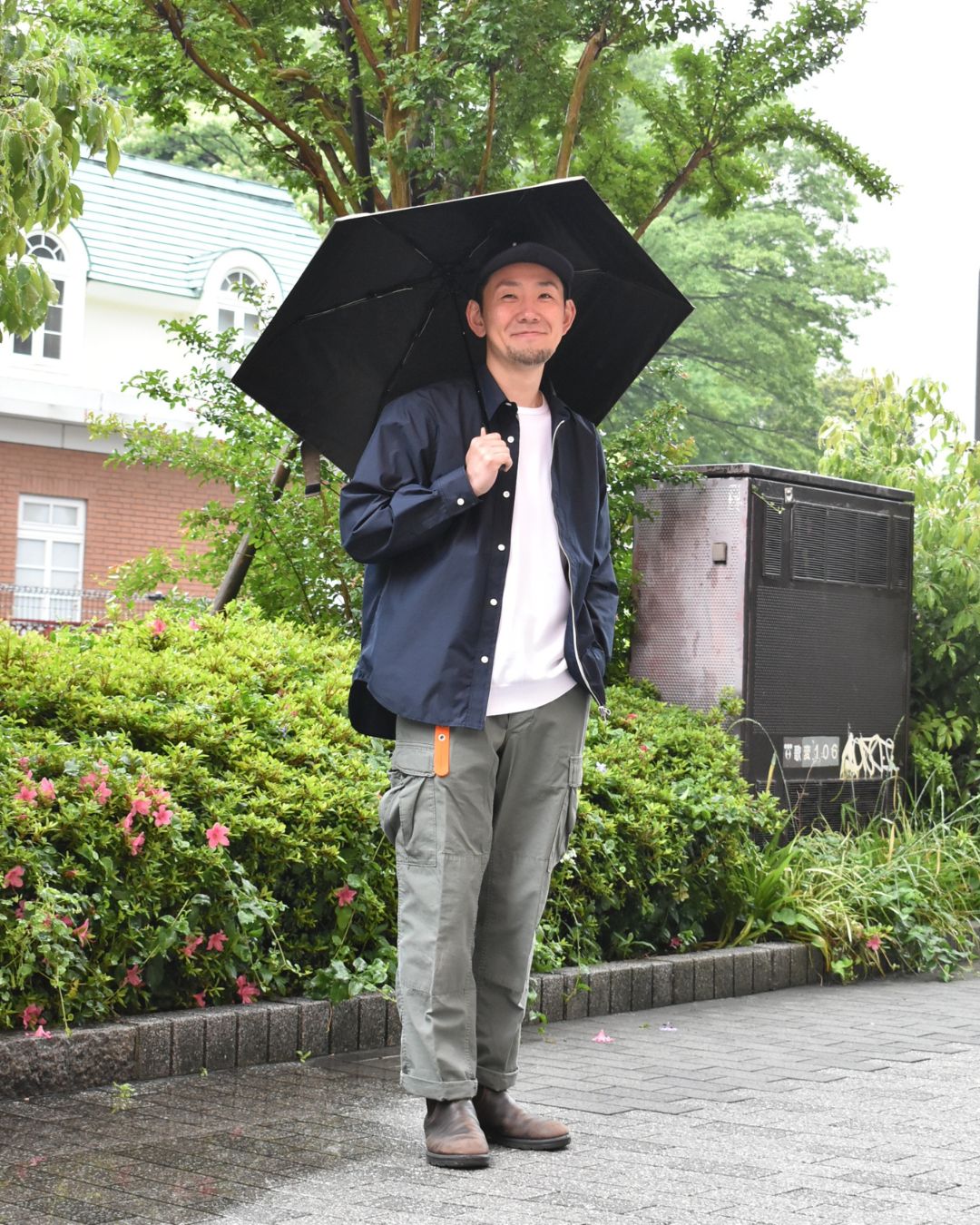 過酷な雨の中の影に協力いただいた大井さんのリアルな雨カジスタイル。ボトムスも肌離れが良く、乾きも早いプロッパーのBDUをチョイスしております。
