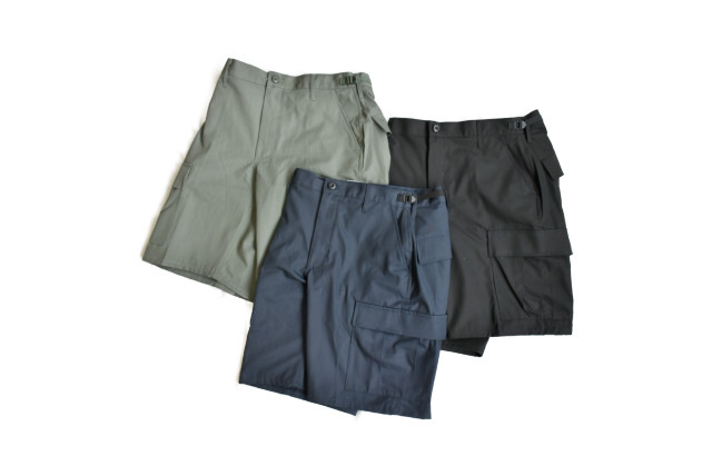 長パンはオリーブ、ネイビー、ブラックの3色展開ですが、短パンはオリーブ、ネイビー、ブラックに加え、カーキ(ベージュ)とウッドランドカモを加えた全5色展開。