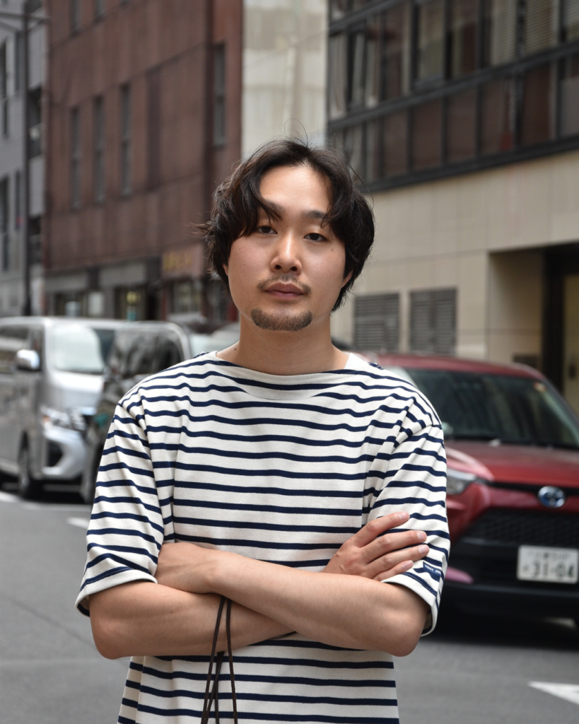 「もう迷わない。エクリュ/マリン。ブランドを代表する配色を、銀座店を代表する俺が着る。ガシガシしてガシり合っている生地ということで夏には自分の懐から遠ざけてしまっていた方もいるだろう。しかし、ここまでガシり合っている生地は肌にまとわりつかない。隊長の話にもあったが、風も通る。加えて乳首透ける問題(チクスケ)もモーマンタイ。体型を隠してくれる効果もあると思うから、その辺気にされている方にもおすすめだ。」