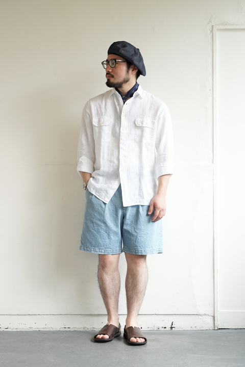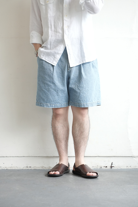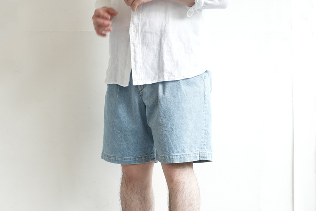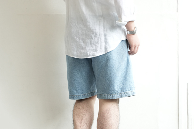 この手のデニムショーツは合わせようでは少年っぽさも出てしまうジャンルかと思いますが、膝上の丈感とグルカショーツをベースにしたこの太さのおかげかシンプルにTシャツと合わせても上手くバランスが取れる1本かと。
