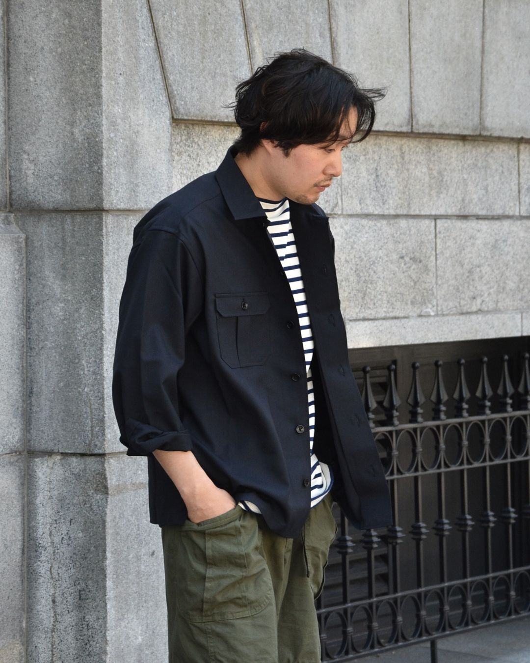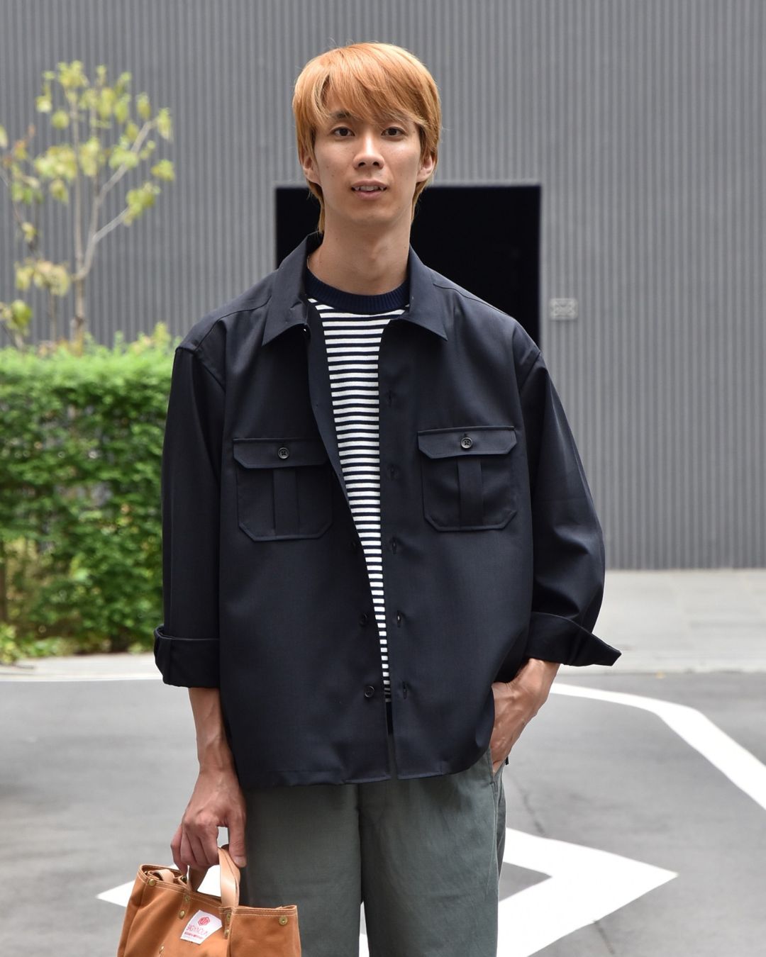 形はフロントに2つポケットを配し、CPOシャツのようなデザインに。