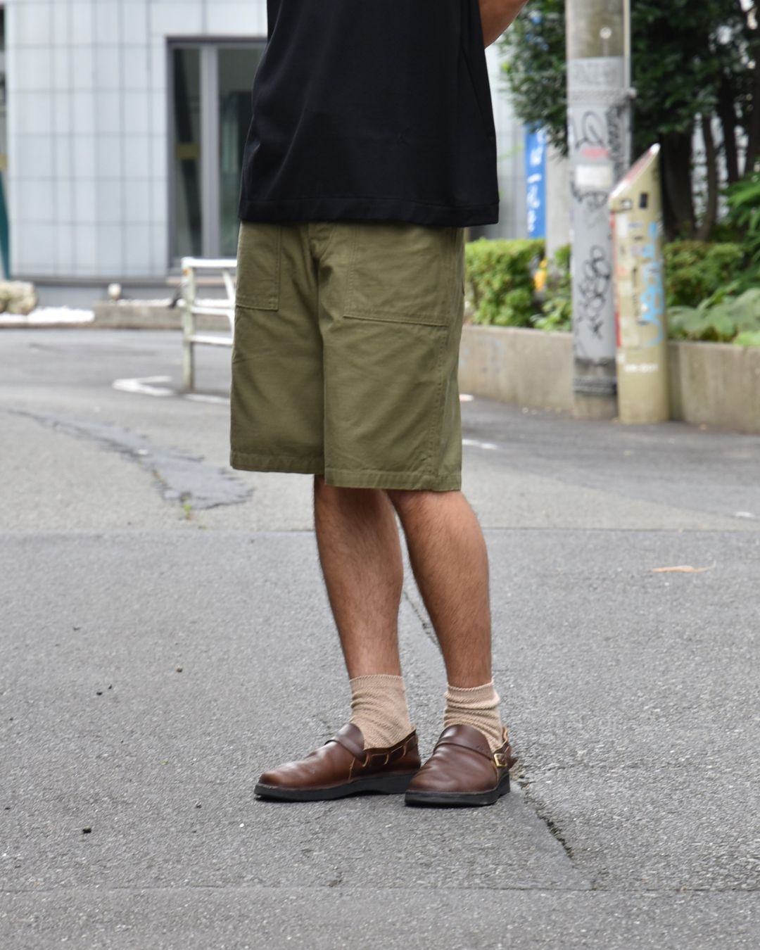 こちらは一般的にベイカーパンツやファティーグパンツと呼ばれる定番なミリタリーパンツデザインをショートパンツに。
