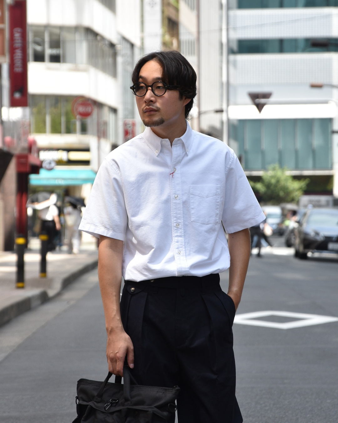 「今日は暑いから昨日より夏仕様さ。サマーニットポロとサマーウール素材のトラウザー。昨日よりカジュアル目なことでよりヘルメットバッグが映える。」