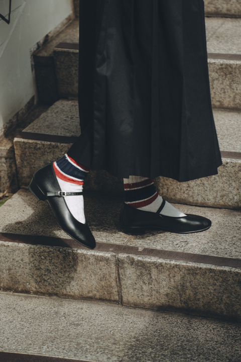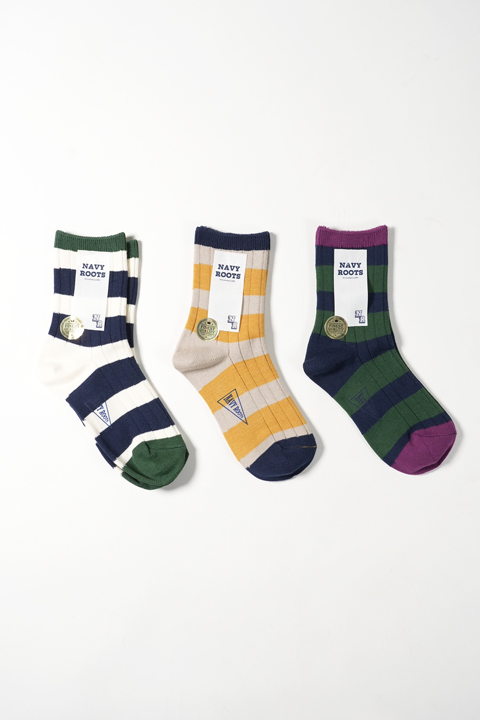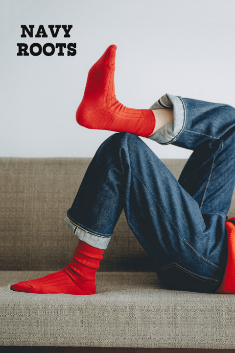 私含め、スタッフ人気も高いネイビールーツのソックス。