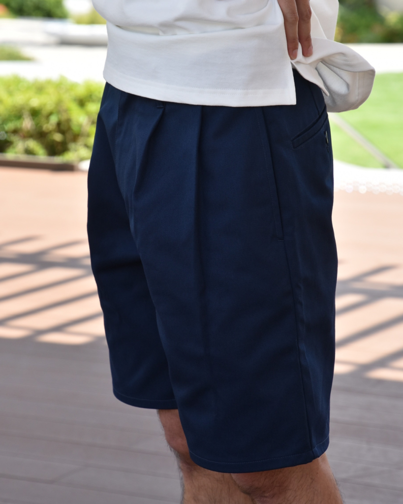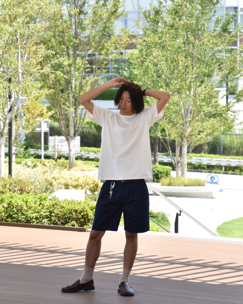 UNIVERSAL OVERALLのツータックショーツに、スピナーベイトの白Tシャツをすっと合わせて、足元はAURORA SHOES。