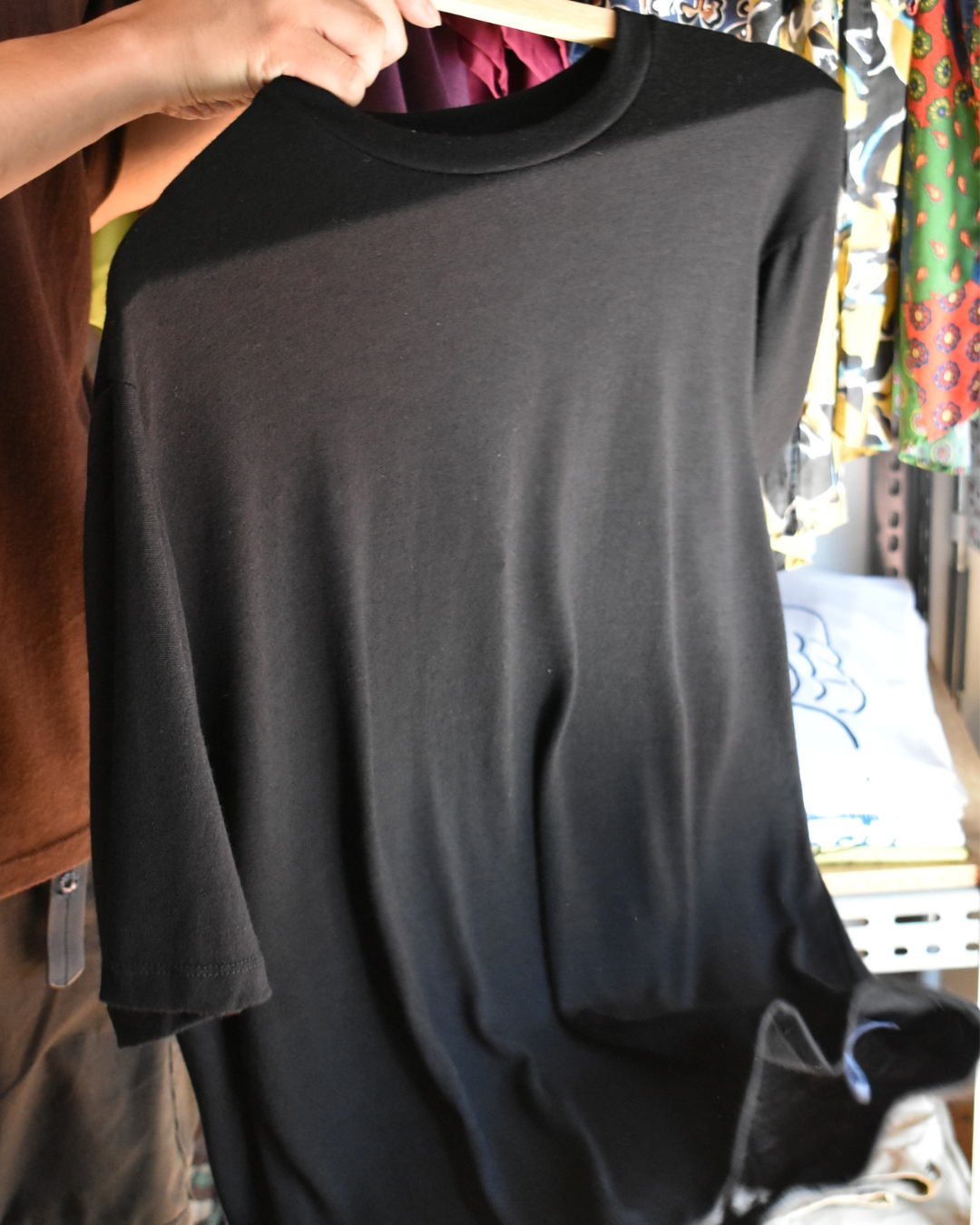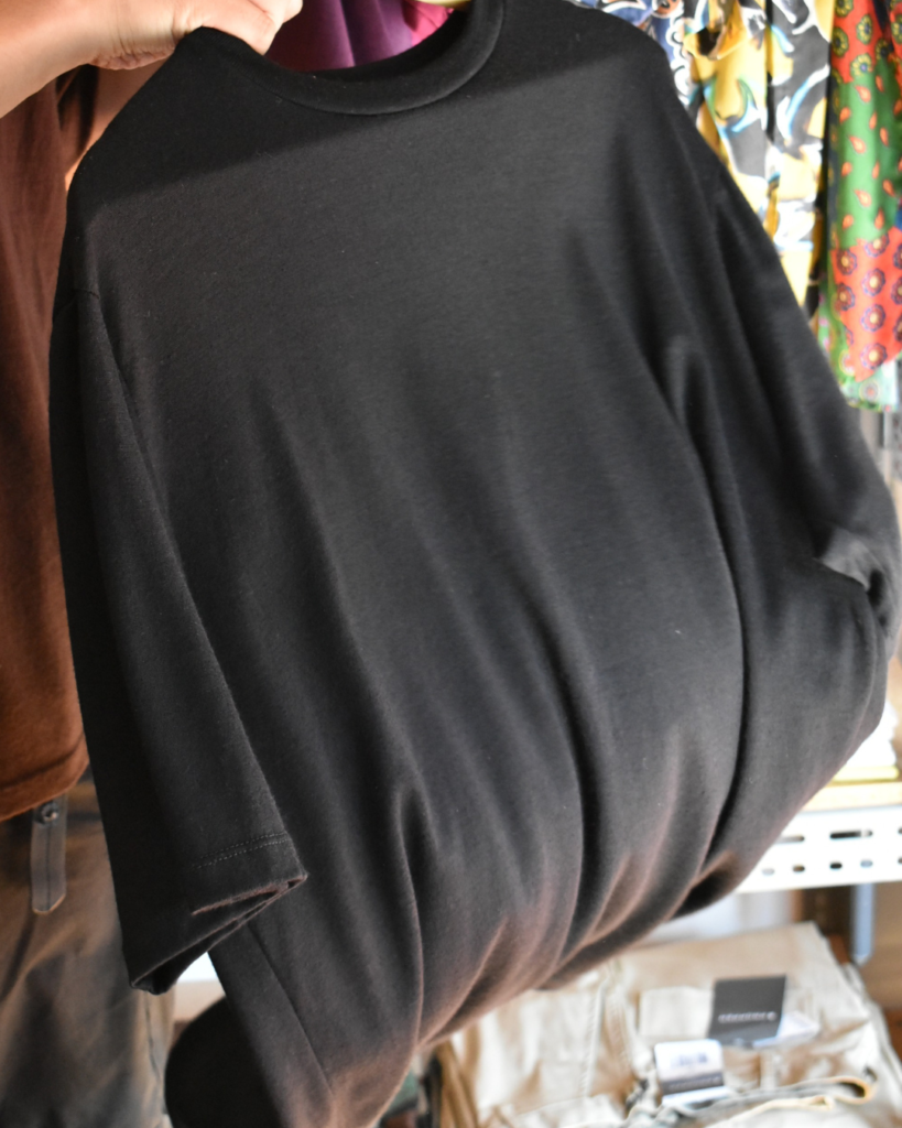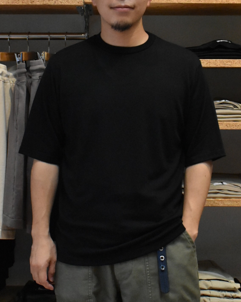 程よくゆとりを持たせるシルエットなので薄いですが体のラインを拾いませんし、他のウールTEEよりもさらに薄くとろみのある生地感のおかげで美しいドレープ感が出ます。