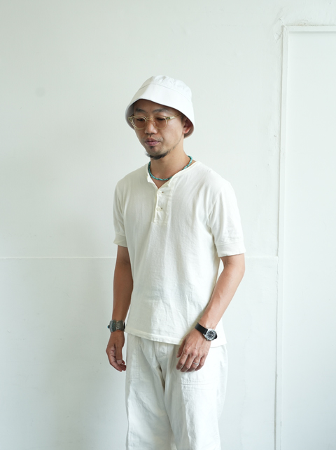 ミリタリーヘンリーネックをベースにしており、袖の針抜きのリブやネック部分も洗うたびに変化が起き、まるで古の時代から着用していた感覚に。