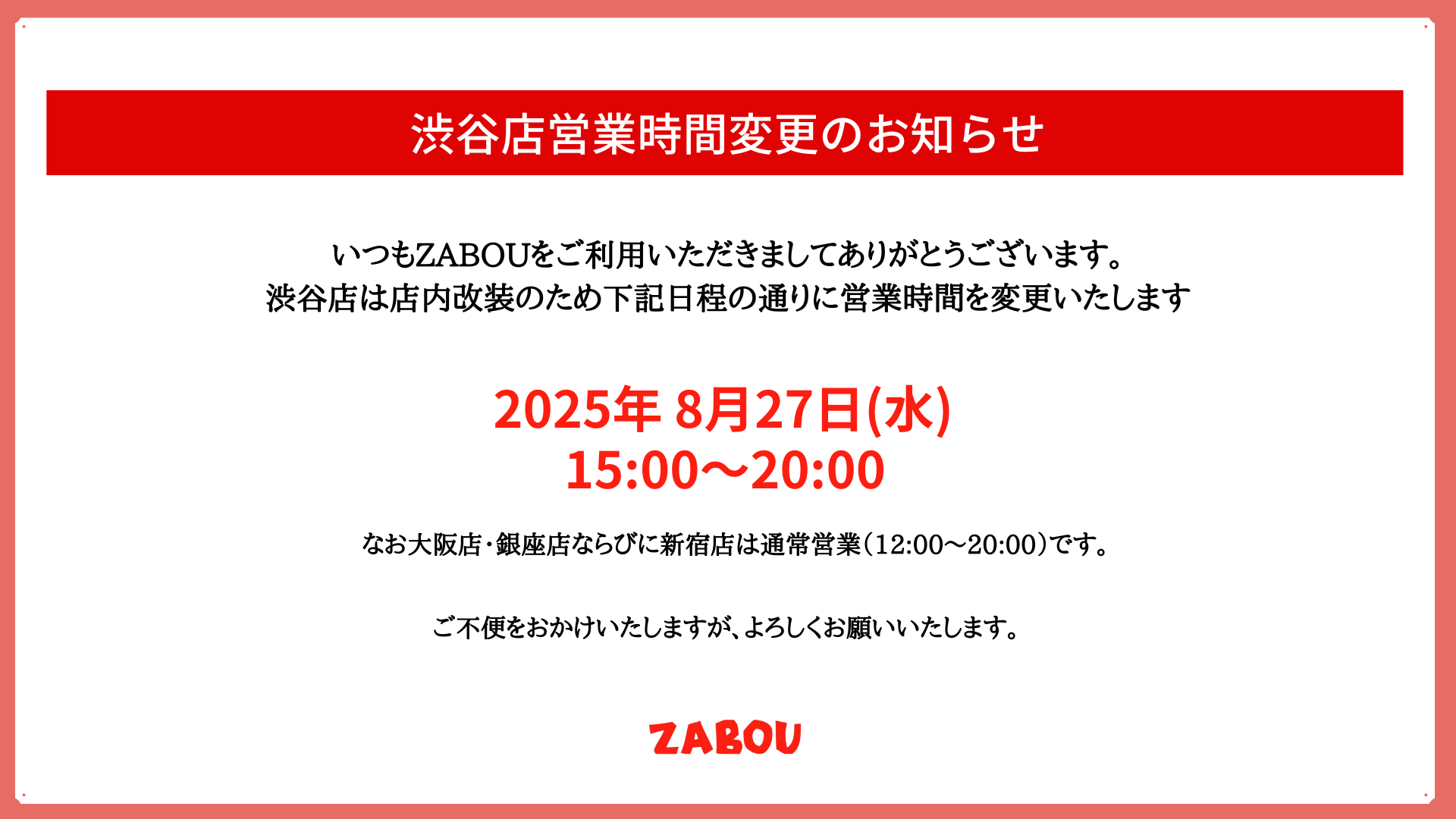 明日の8月27日(水)ですが渋谷店のみ店内改装のため営業時間が変更となります。