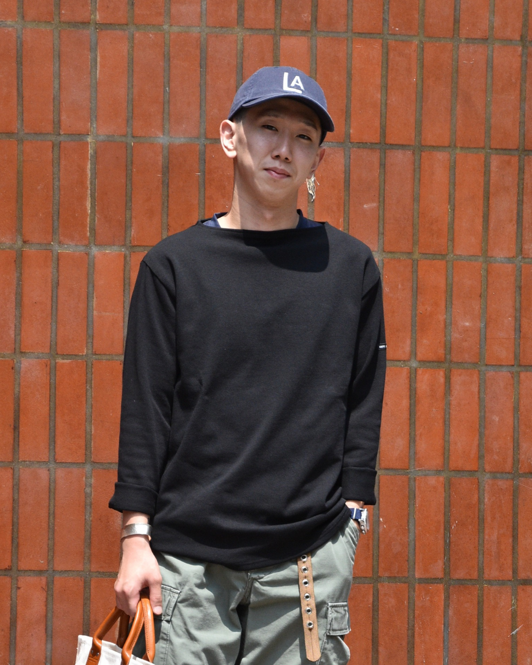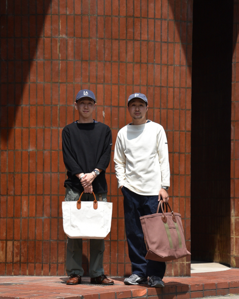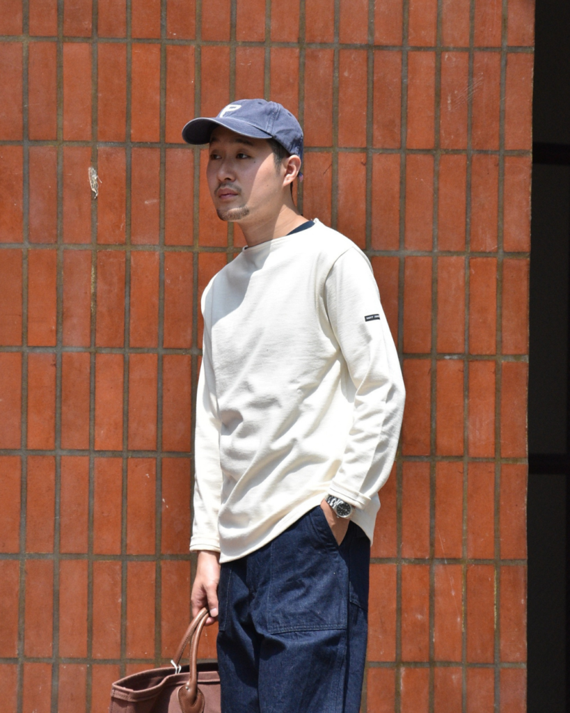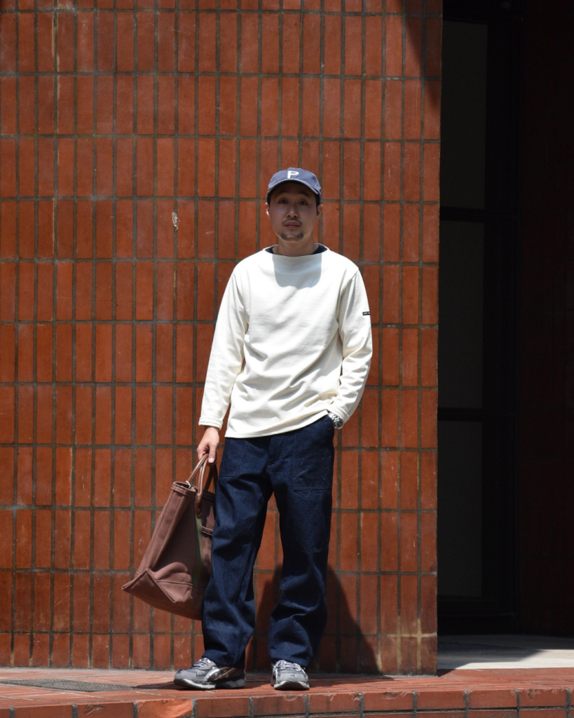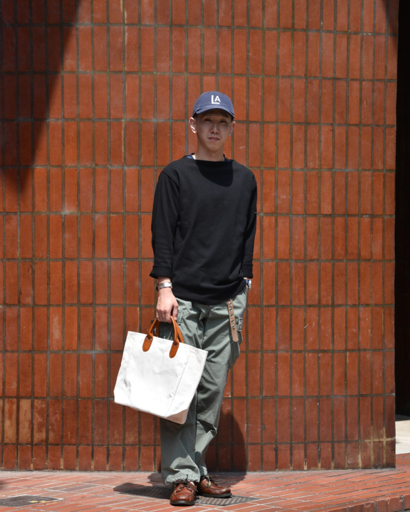 どちらもソリッドな表情のアイテムに、レザーハンドルのトートが組み合わさることで大人っぽさが出ています。使い込んだクーパーズはスタイル全体に味のある雰囲気をくれます。これはもう、味男ですね。