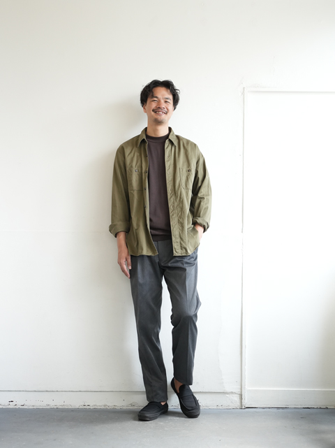 「オリーブにブラウンは秋を感じる組み合わせで、個人的オススメ。パンツは太目のグレーのスラックス。こちら近日発売の別注マッカーサー。