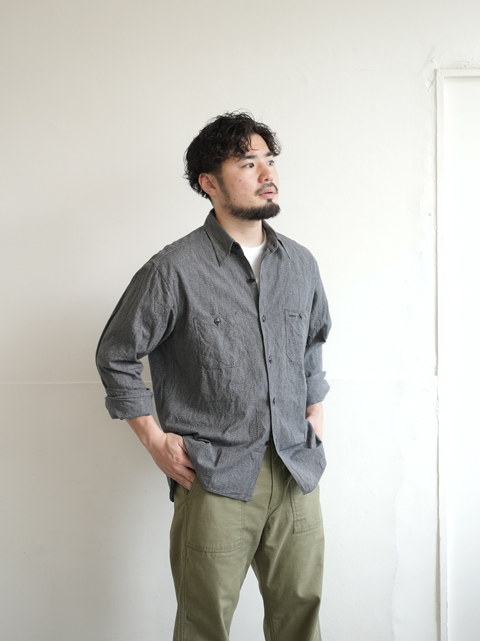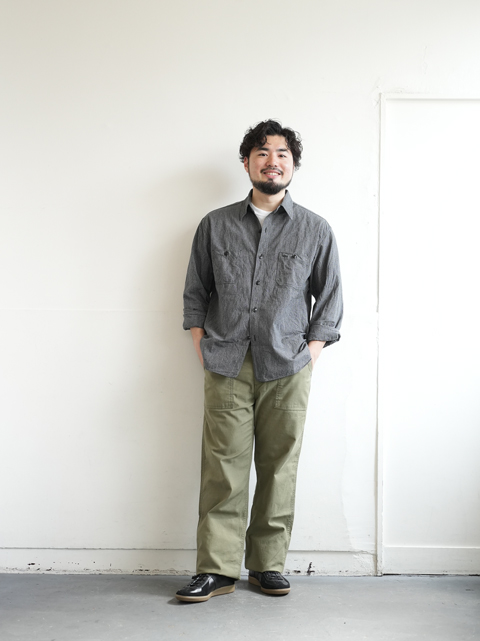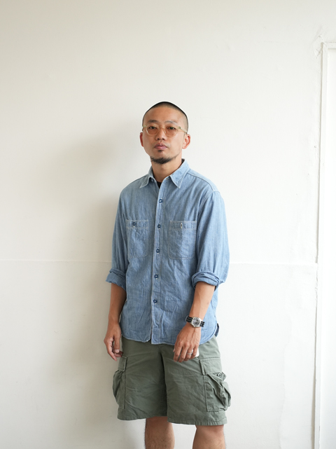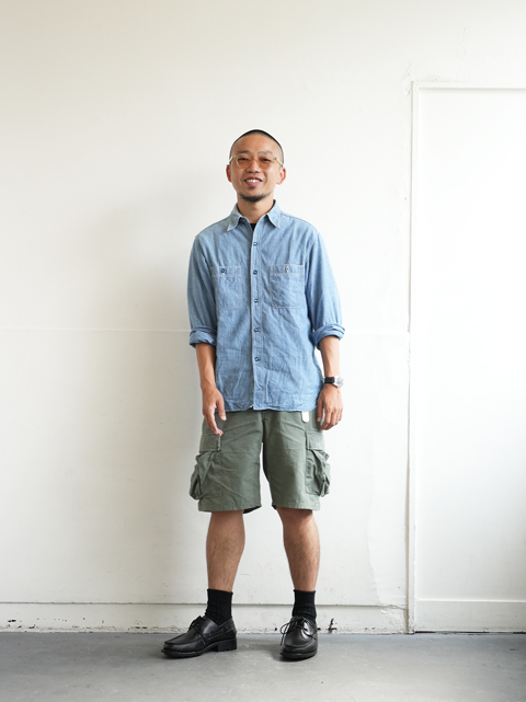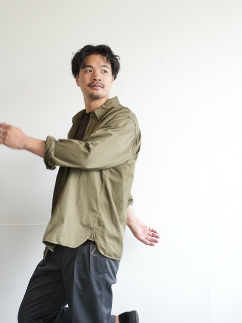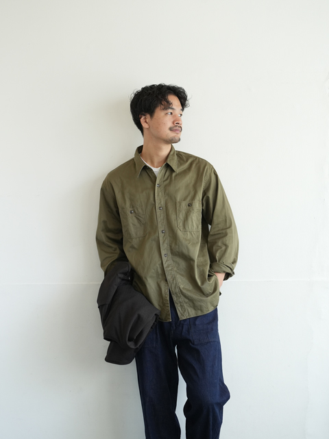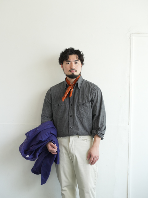 「生地に比較的厚みがあり、羽織りにピッタリのシャツ。昨年から気に入って着ている私物で少しアタリなども出てきて、経年変化しています。