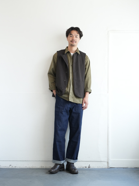 ベストを羽織るとシャツのミリタリー感が良い感じに和らぎます。アウターとして着れて中間着るにも使える魔法のアイテム。」