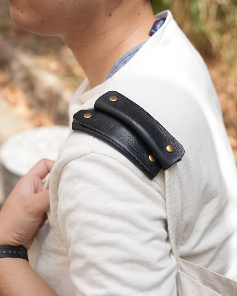 写真の様に白系のトップスで肩掛けすると摩擦や汗で色移りのリスクもあります。