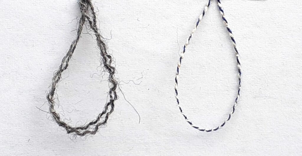 杢糸とは写真のように色糸と白糸を撚り上げられた糸の事で、糸自体に色のムラが出来て表情があります。