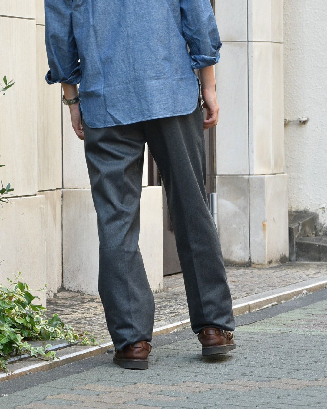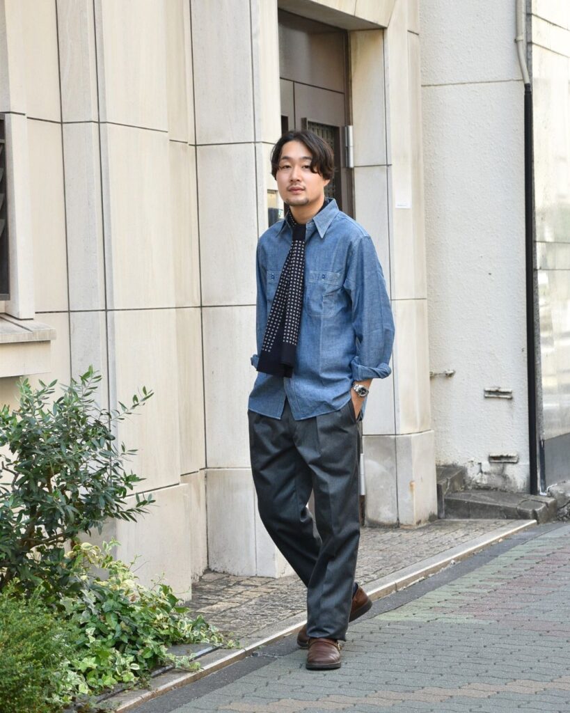 合わせるアイテムもシャンブレーシャツにオーロラシューズと言ういつもの組み合わせですが、パンツが程よくちゃんとしていると、丁度いいバランスにまとまりますね。