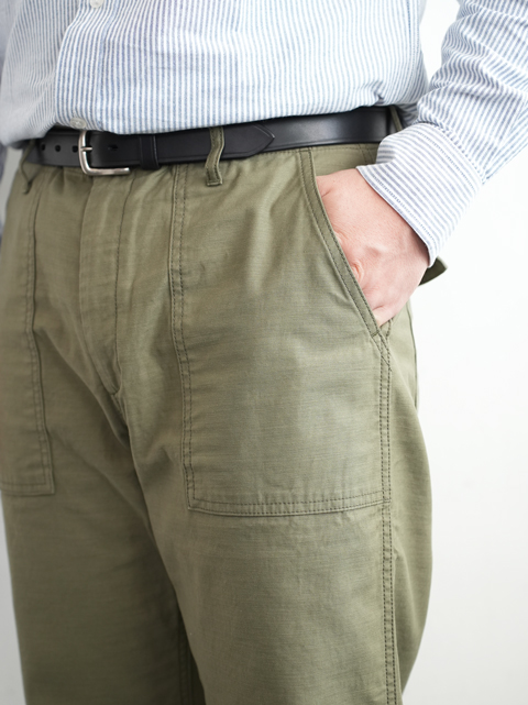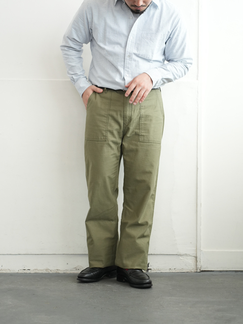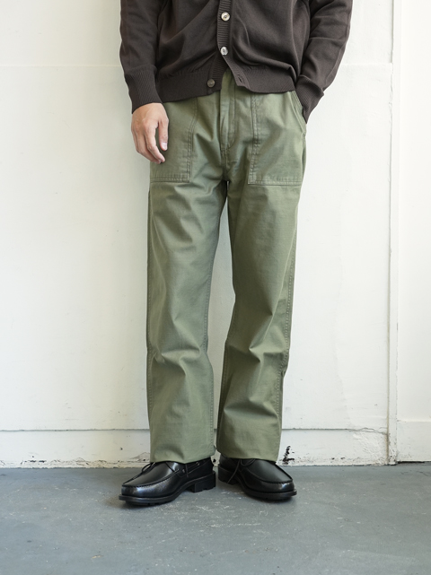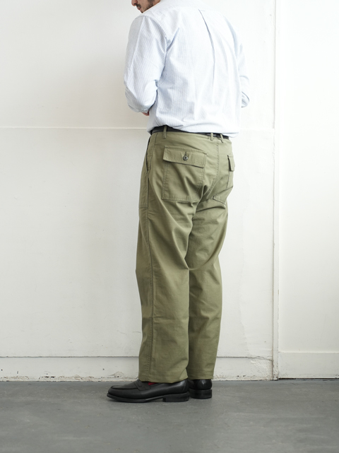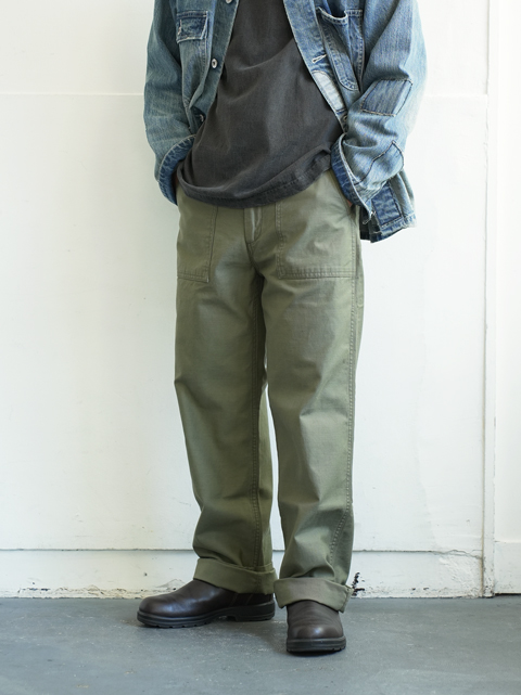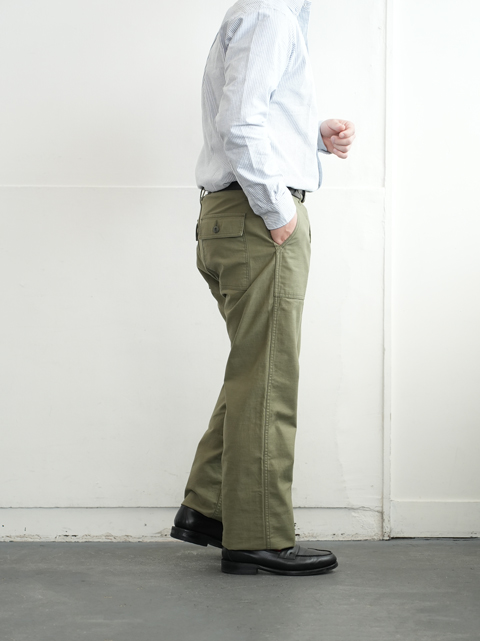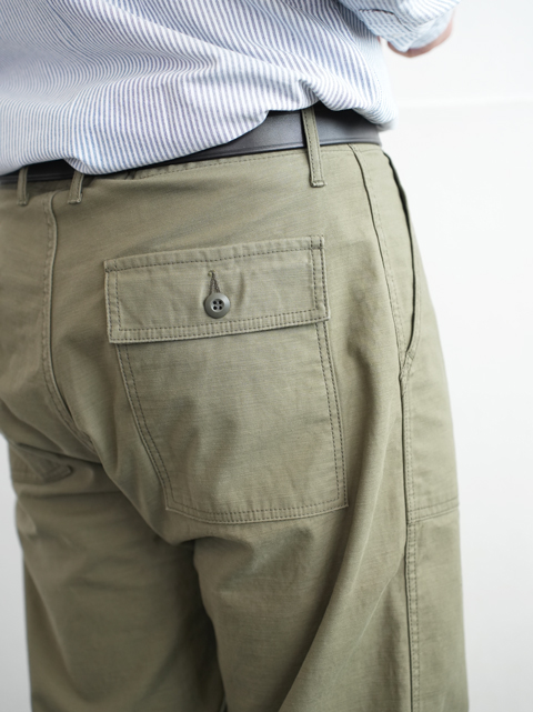大きなパッチポケットが前後に4つ、それ以外は特段目立ったディテールはありません。軍パンというにはあまりにもシンプルな佇まいですが、そのシンプルさゆえコーディネイトにも落とし込みしやすく、汎用性が高い。