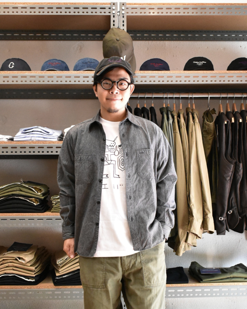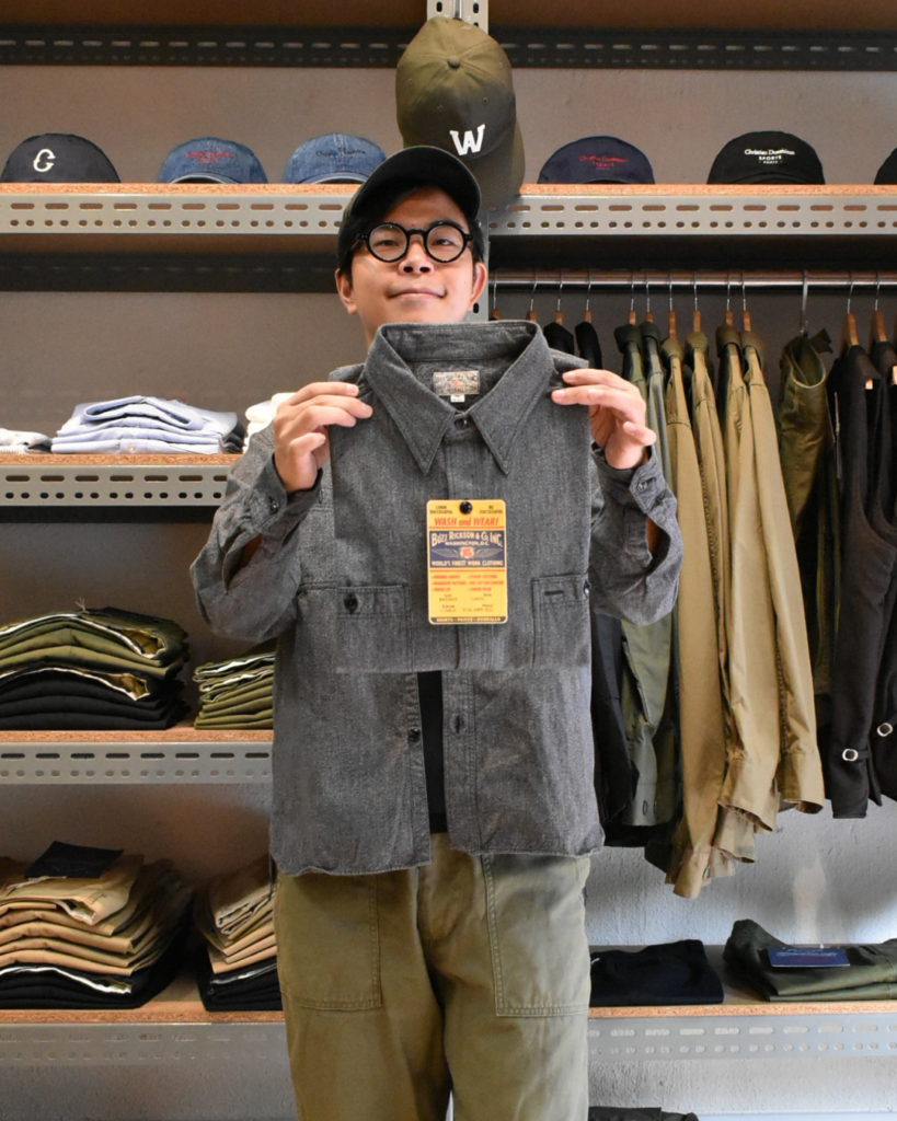 形は定番シャンブレーシャツとほぼ同じ。漢らしいワークなレギュラーカラーシャツです。