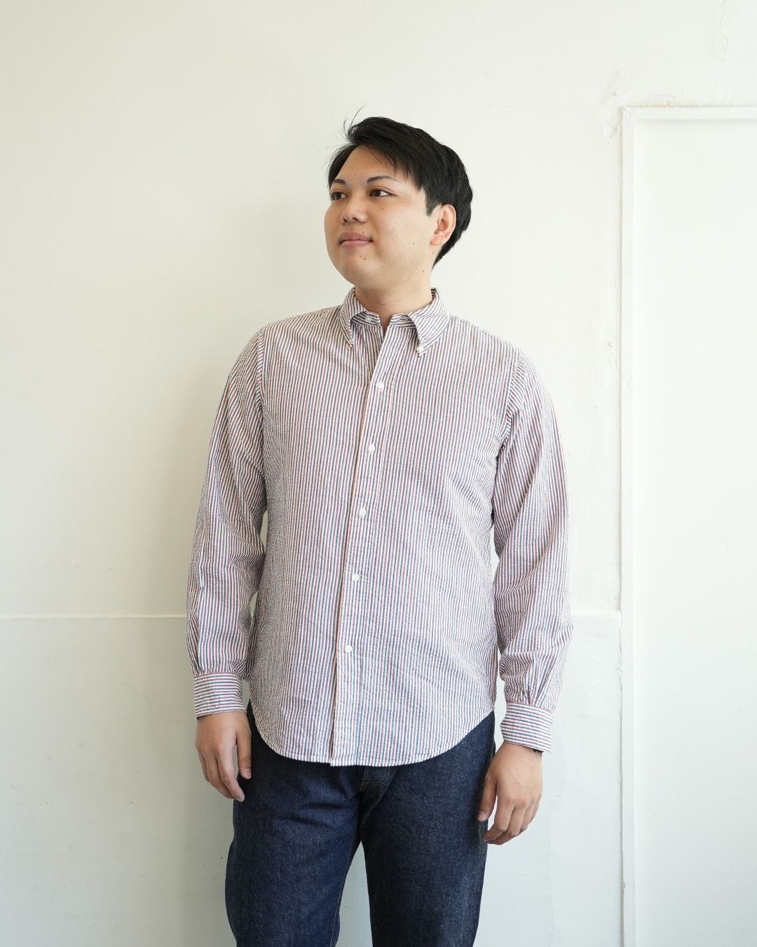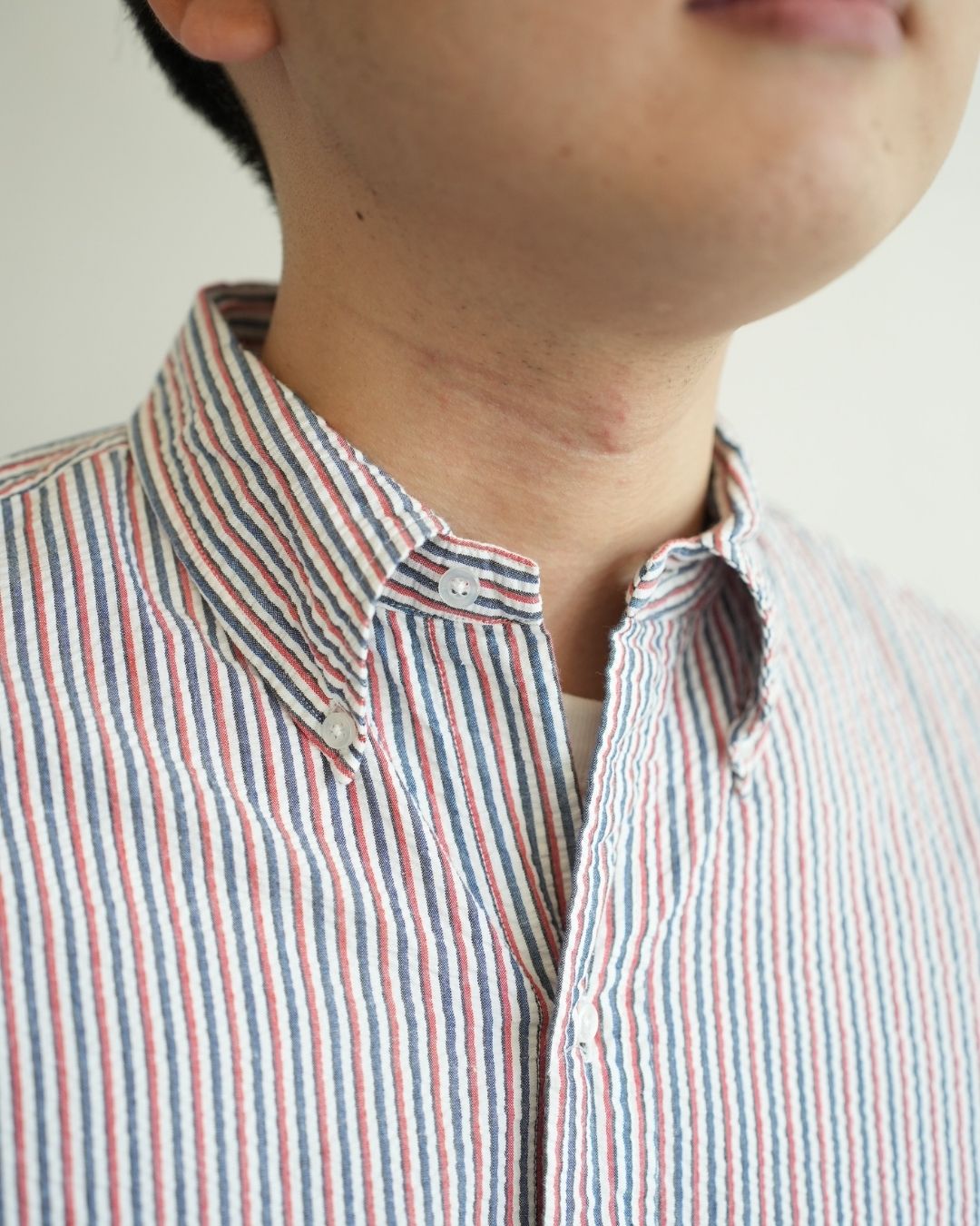 ストライプに青が入っているのでデニムとの組み合わせも自然。ヘビロテ間違いなしの一着になるでしょう。
