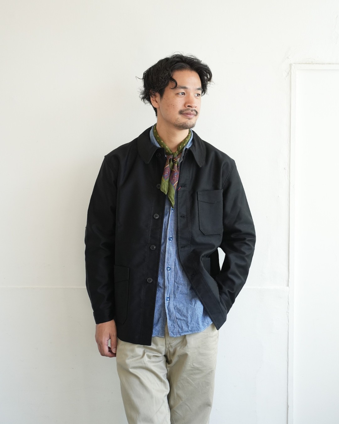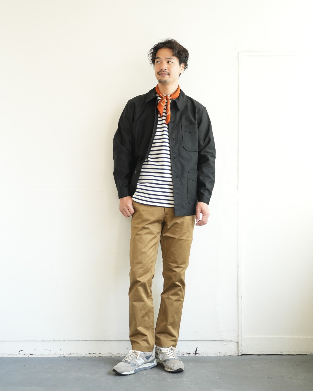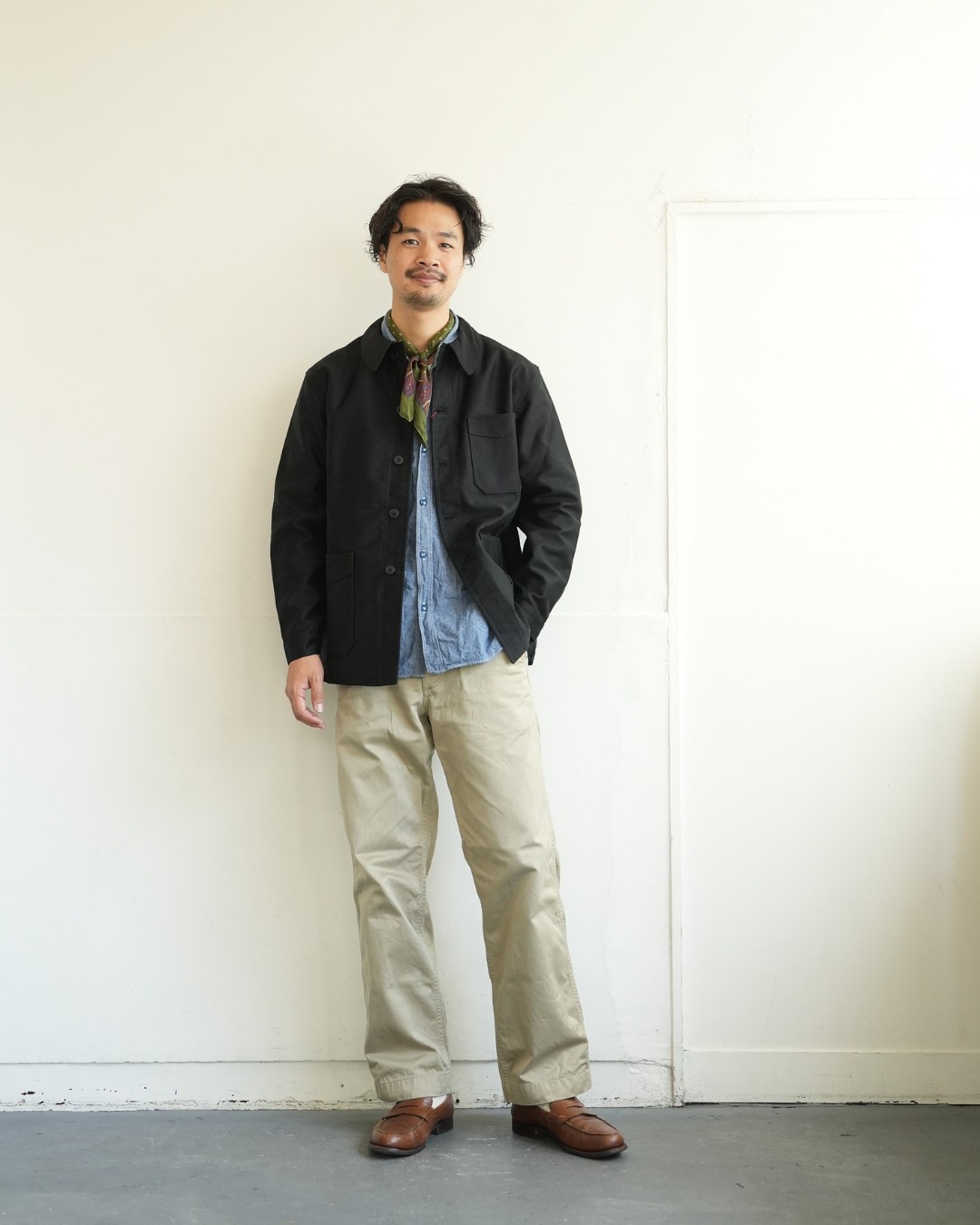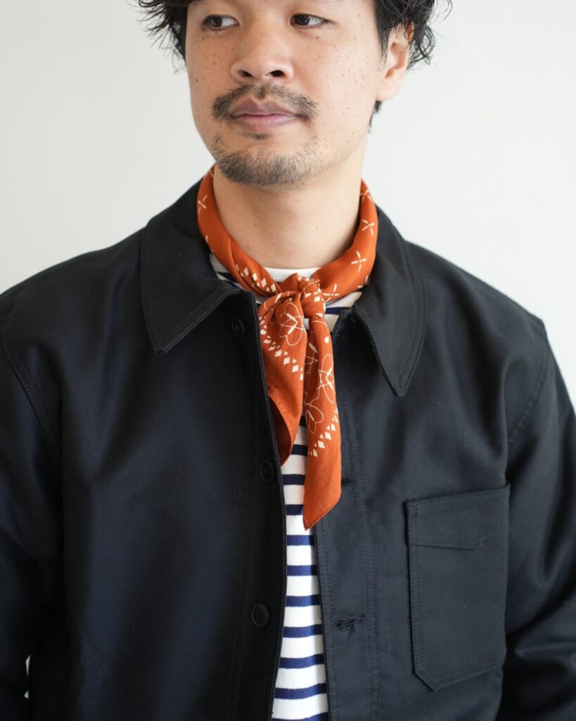 ウエッソンと合わせて王道のフレンチカジュアルを楽しむもよし、シャンブレーシャツにミリタリーチノのアメリカンな組み合わせにもイケちゃうのが面白いところ。首元にスカーフを巻いてあげるとちょっとフレンチ感でるか?と思ったら案の定良い感じに。ジャンル問わず着て頂ける普遍性が良いですね。